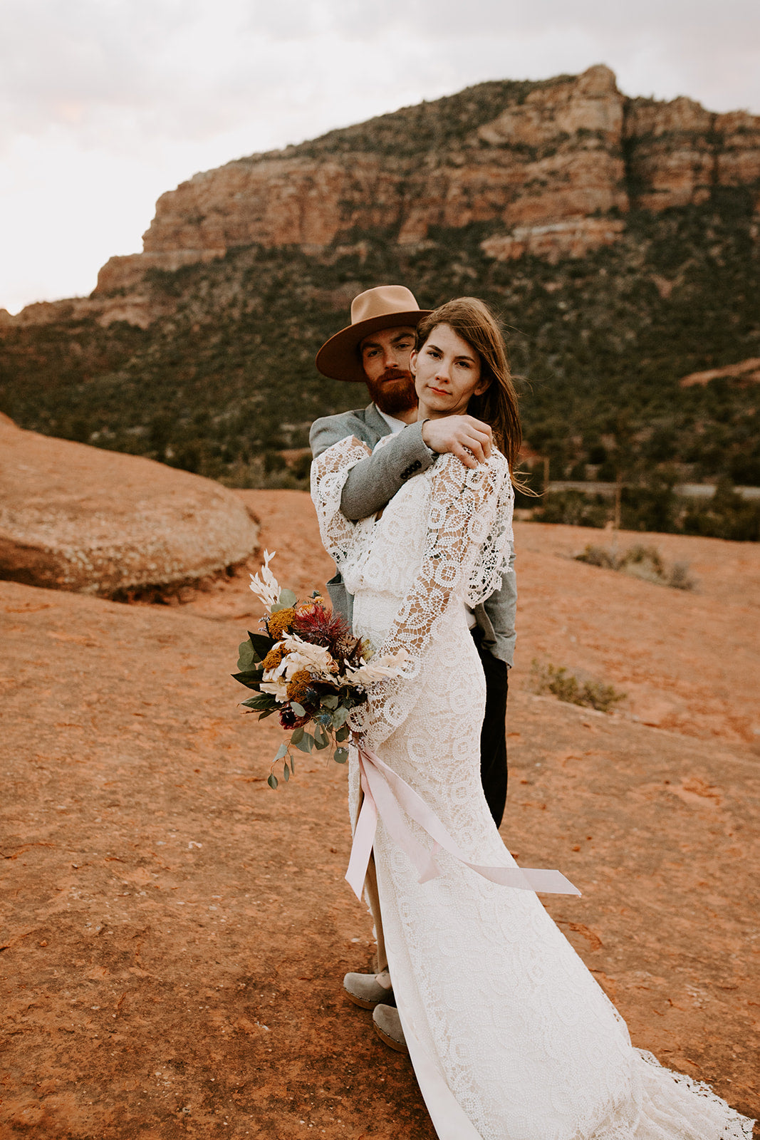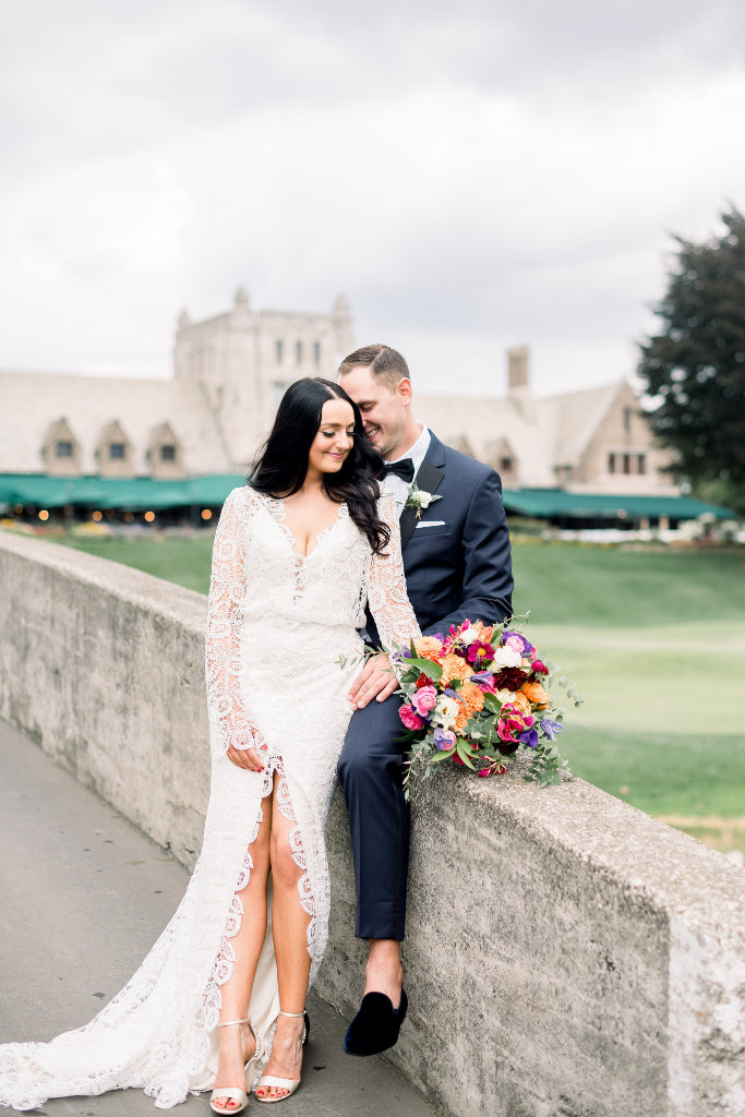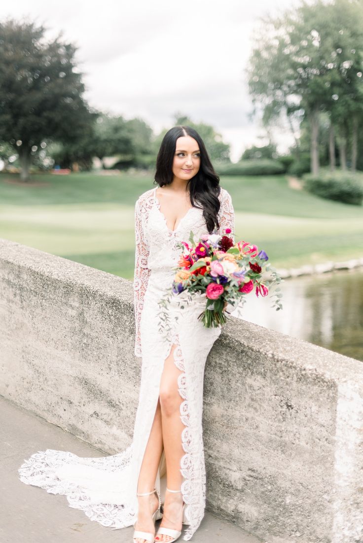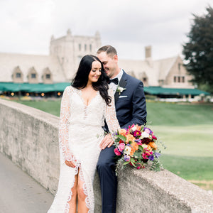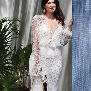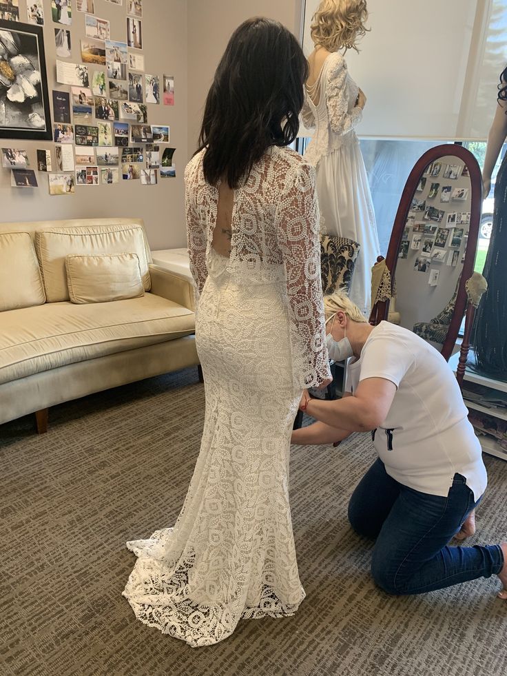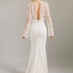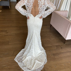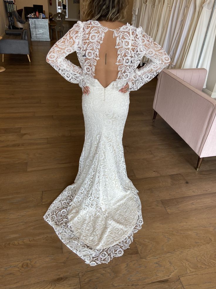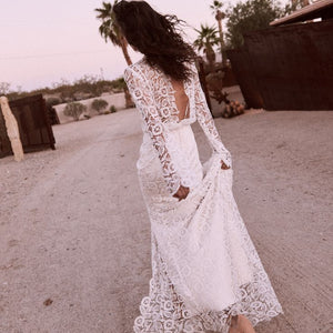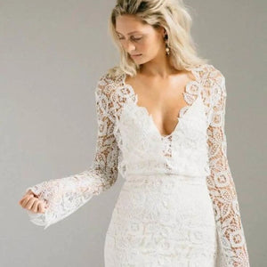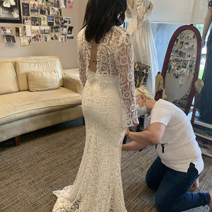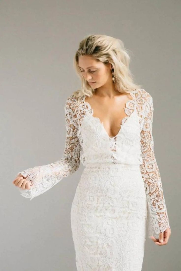 Calling the BOHO brides! Having an intimate wedding in the mountains or elopement? Halsey is calling your name. She's a bell sleeved lace gown with a center slit and a keyhole back. Roll the sleeves up for a cool, laid back look.