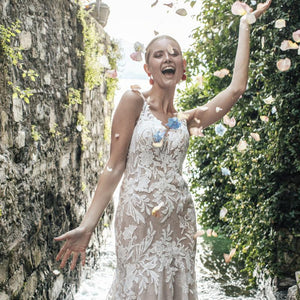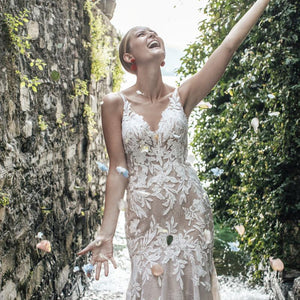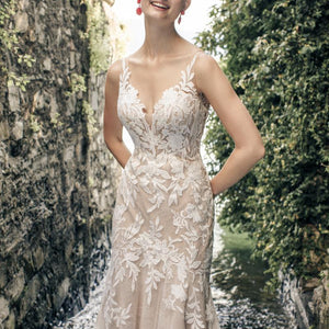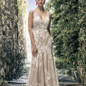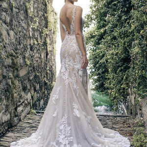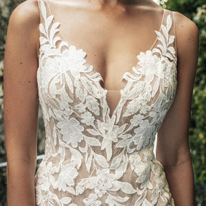 Celebrate the romance of the Madison James "Hope" lace fit-and-flare gown. Adorned with delicate lace appliques over alenon lace, this gown is a vision of timeless elegance. The plunging neckline and low back add an alluring touch, creating a perfect blend of sophistication and romance. Designed for a romantic outdoor ceremony or a breathtaking beach affair, "Hope" is the epitome of grace and style. Let this gown be the canvas for your love story, as you embark on a journey of elegance and beauty on your special day.