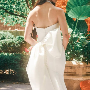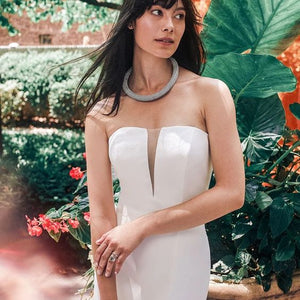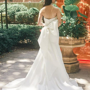 The Logan gown draws inspiration from the timelessness of an understated strapless silhouette. Madison James MJ805 is an elegant matte satin fit and flare wedding dress. This sleek silhouette has a strapless bodice and a chapel-length train. This dress DOES NOT comes with the detachable oversized bow in the back.