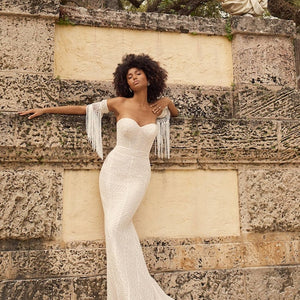 Who says math can’t be a romance language? This geometric lace bridal dress is a love sonnet unto itself. Maggie Sottero Dover is an eye-catching lace gown! This gorgeous look features a strapless sweetheart neckline, slightly flared skirt, + allover geometric lace! Please note, the arm cuffs pictured are not included. Maggie Sottero Dover is Ivory/Blush.