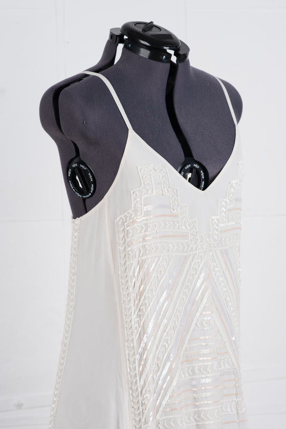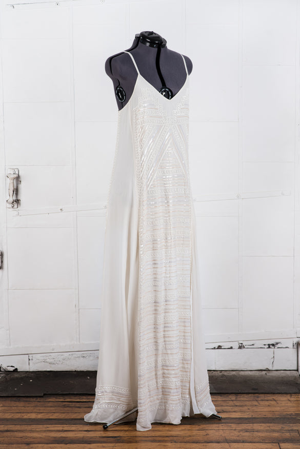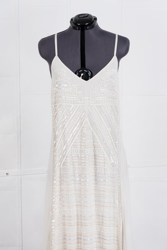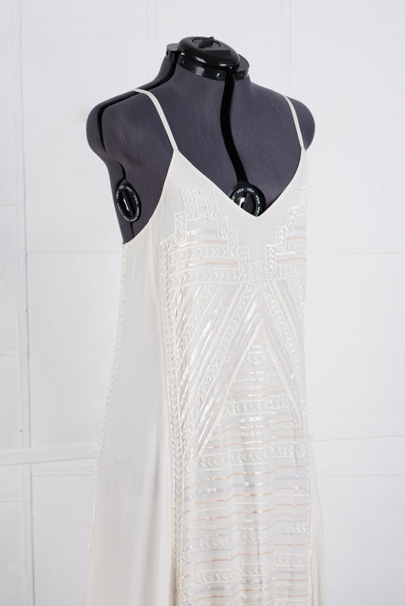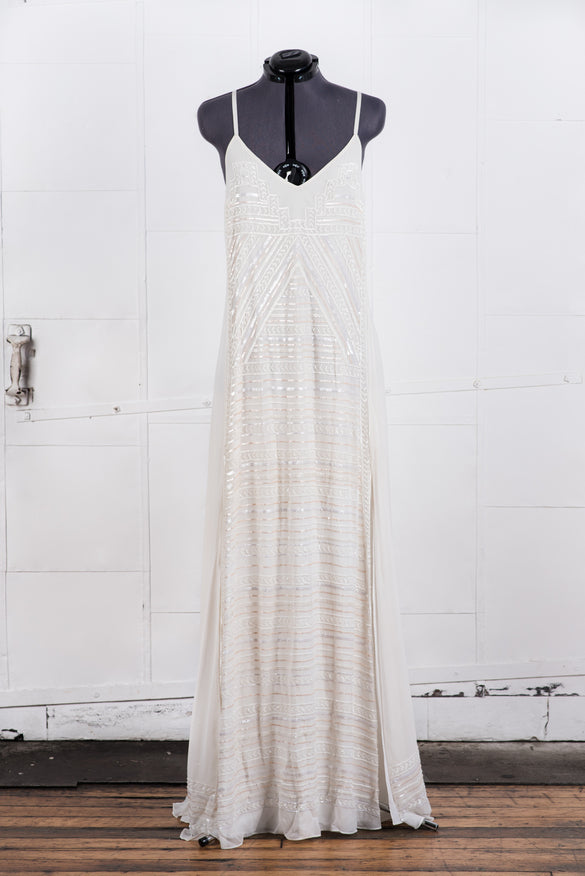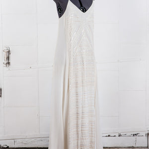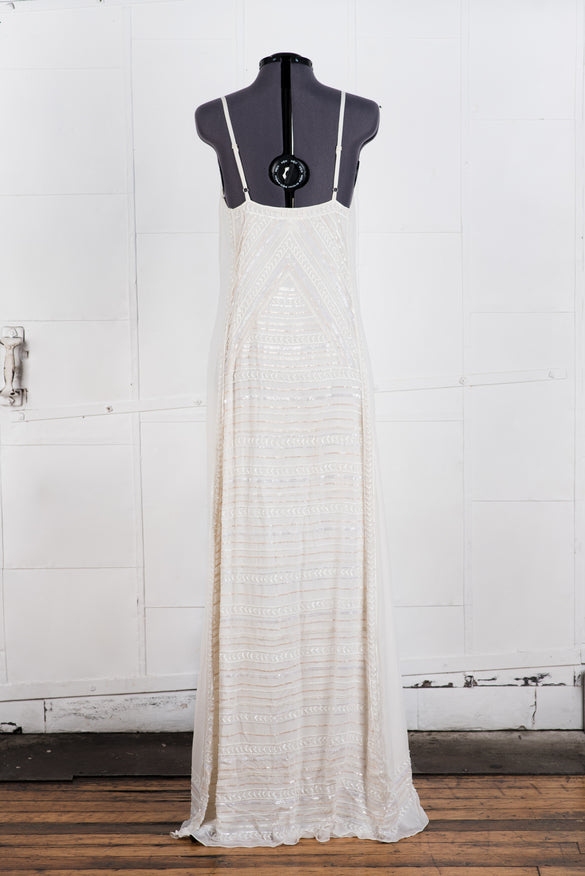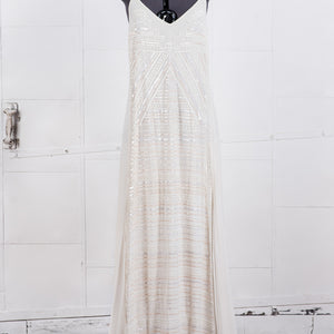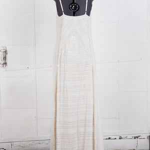 Beautiful silk and sequin wedding gown by Mara Hoffman. Effortlessly chic and bohemian in style with side slits. Outer shell is 100% silk.