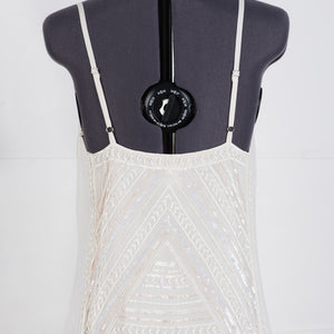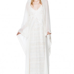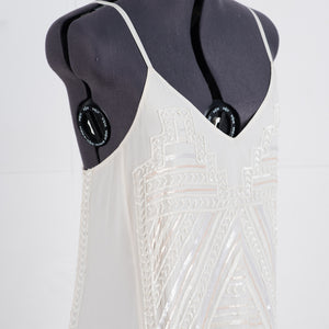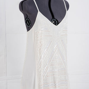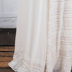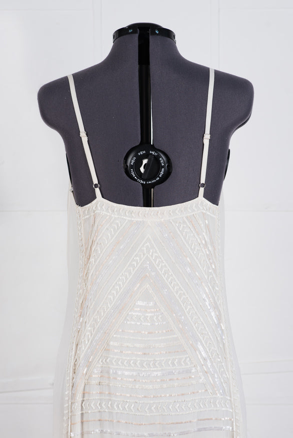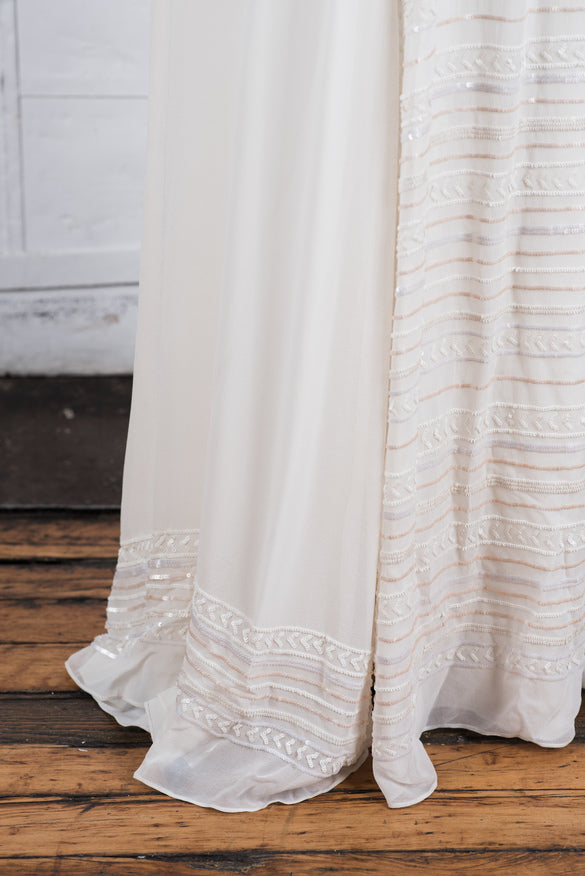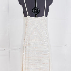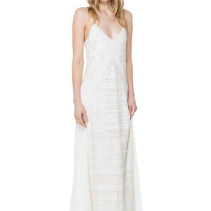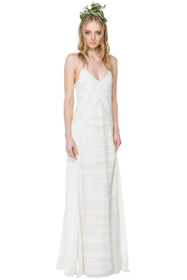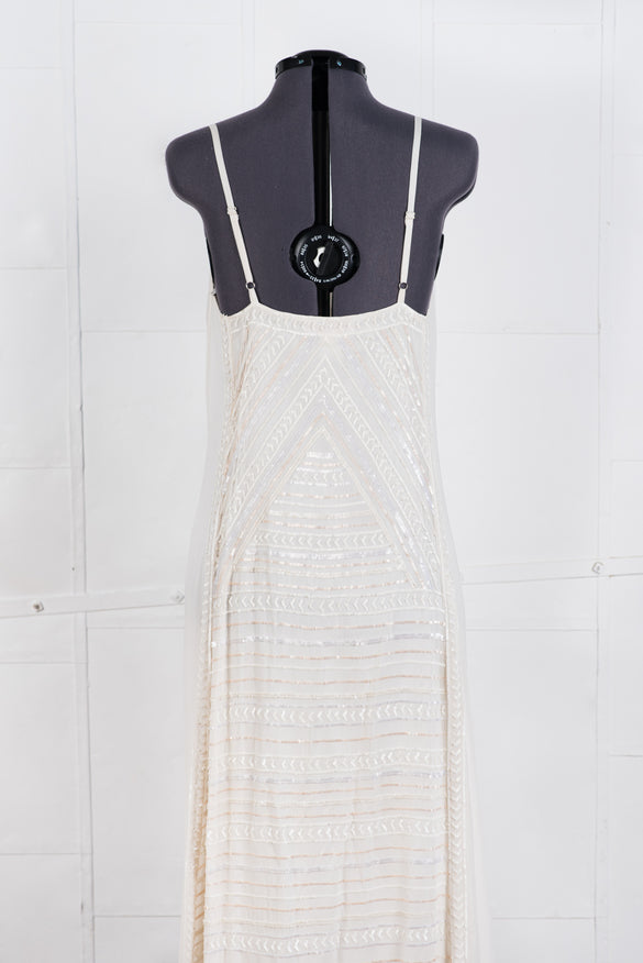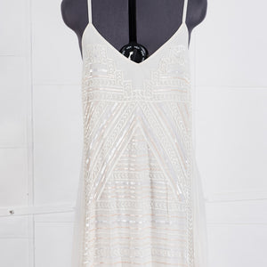 Beautiful silk and sequin wedding gown by Mara Hoffman. Effortlessly chic and bohemian in style with side slits. Outer shell is 100% silk.