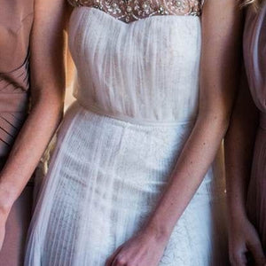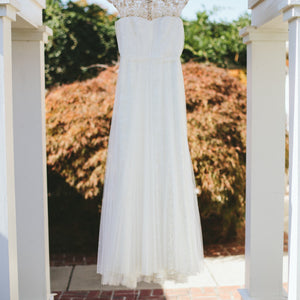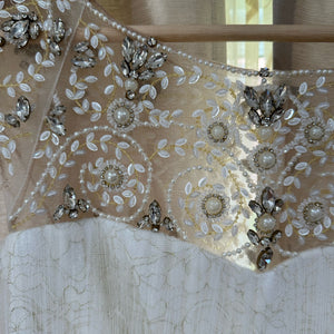 Dazzle in this modern, hand-beaded design. A perfectly draped tulle skirt plays off a bejeweled sheer neckline in a way that's positively stunning, while gold metallic lace peeks through a layer of soft tulle for the finishing shimmer. (Sash not included).