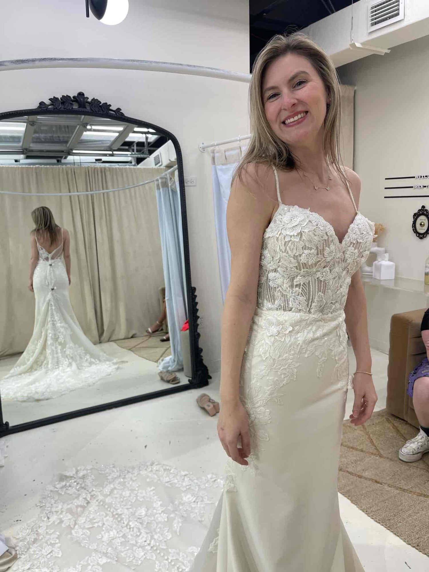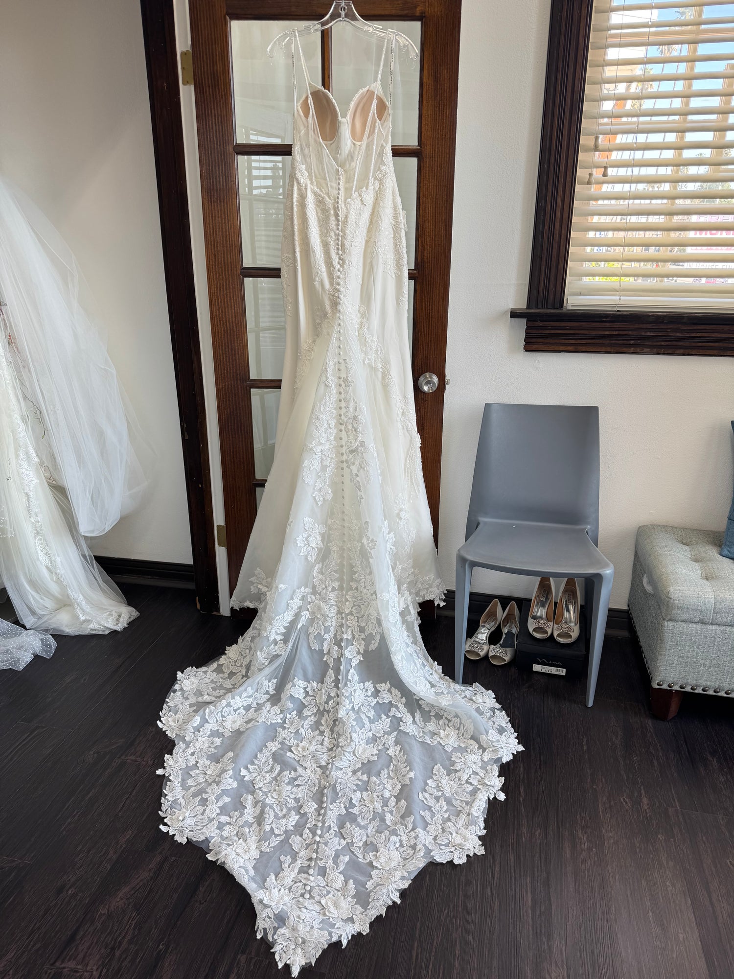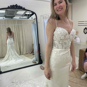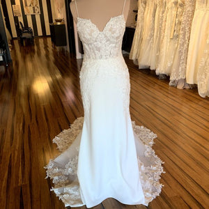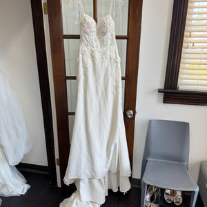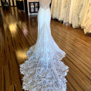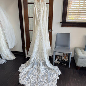 Has been tried on in store and has a few small holes in the netting on the back by the zipper (see last pictures of actual dress). Otherwise in excellent condition. Price has been reduced accordingly. Retail price: $2,800.
