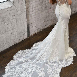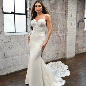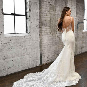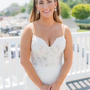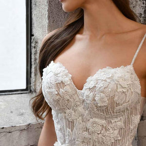 Timeless romance meets chic glamour in Style 1390. The romantic-defined bustline with a sweetheart neckline is effortlessly sexy, with the corset-inspired look continuing to the back of the bodice. Stylish boning framed with illusion tulles adds sexy structure, accented with fabric-covered buttons. Linear lines of sequin details in the bodice add an ultra-chic touch to this wedding dress, with floral lace layers on top of exquisite dimension. Beautifully textured lace appliques hug the hips and trail down the skirt along the sides for a romantic look. The long lace train is decorated with large-scale lace appliques all the way to the hem for an oh-so-dreamy walk down the aisle.