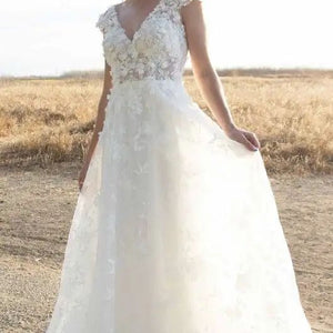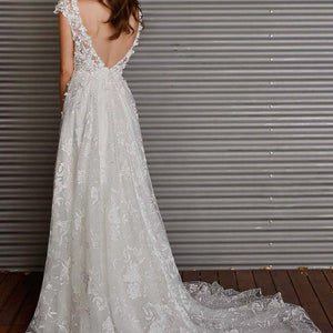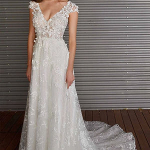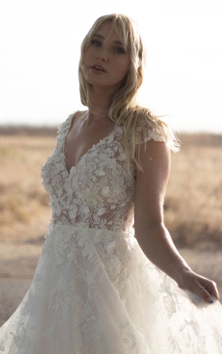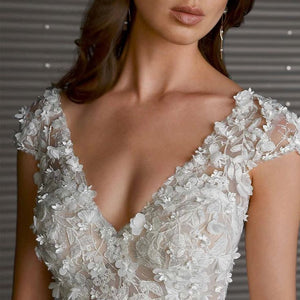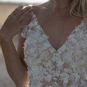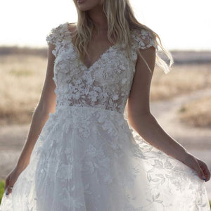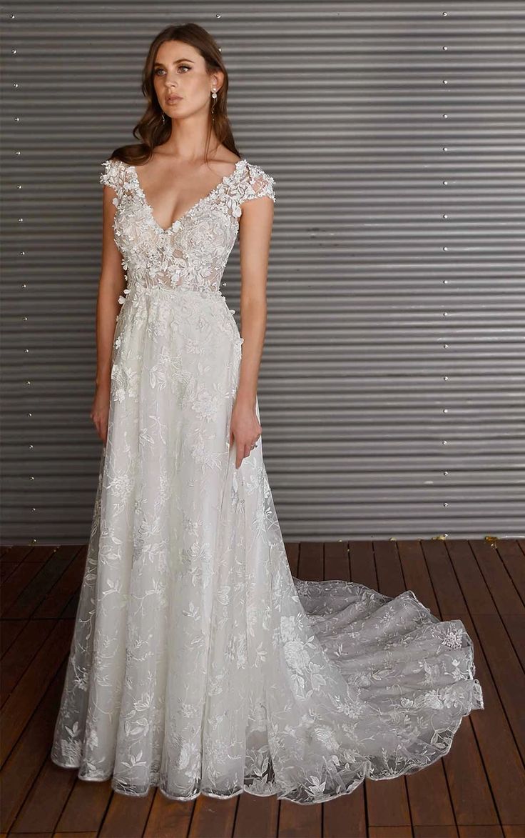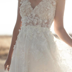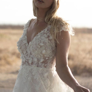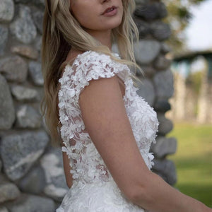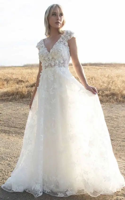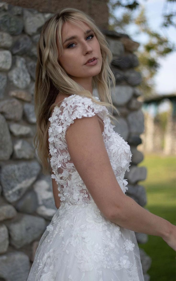 This gorgeous aline gown features cap sleeves and 3D lace throughout the gown. Style 1447 from Martina Liana radiates sweet sophistication and breathtaking beauty. The flattering V-neckline and classic cap sleeves are timeless and chic, while the whimsical chiffon florets and sheer bodice highlight the ultra-feminine silhouette of the couture wedding gown. Gorgeous 3D floral appliques, intricately embroidered lace and subtle shimmer add texture and dimension to the design. The V-shaped open back leads to a romantic lace train that moves with grace, elegance and ease as you float down the aisle toward your happily ever after.