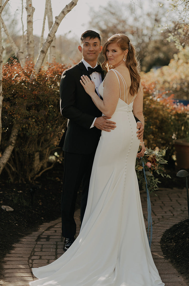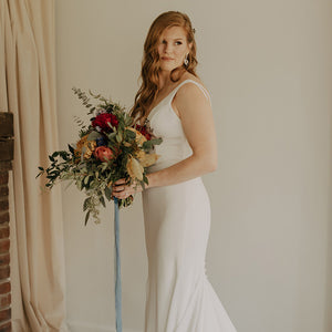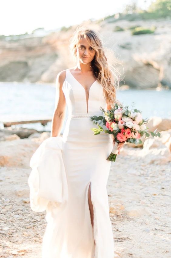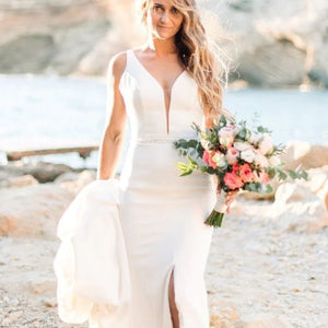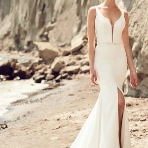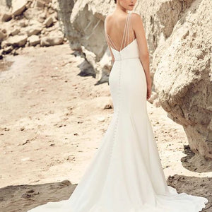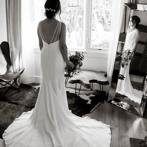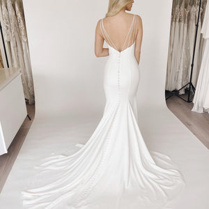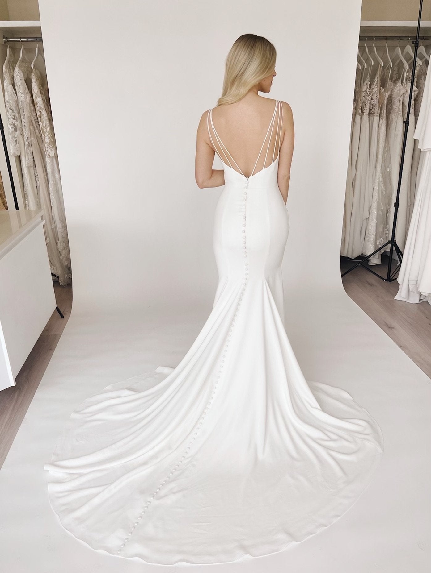 Crêpe Wedding Dress. Crêpe bodice with plunging V-neckline and multiple crossover spaghetti straps at back. Crêpe fit and flare skirt with center front slit. Fabric covered buttons down center back of skirt to hem. Removable beaded belt at waist (not included).