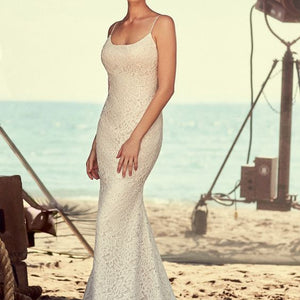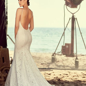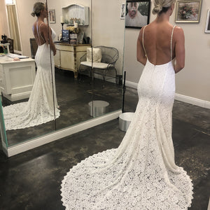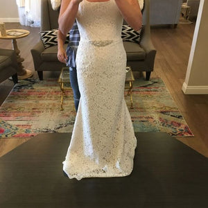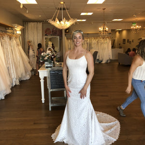 Mikaella Lace Wedding Dress. Lace gown with scoop neckline and beaded custom beaded spaghetti straps. Fit and flare lace skirt with scalloped hem. Light in weight, three thin layers. Top layer is all lace. Bottom two layers are natural colored.