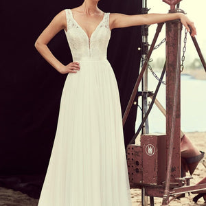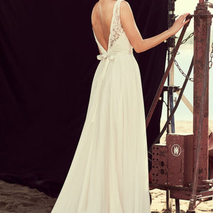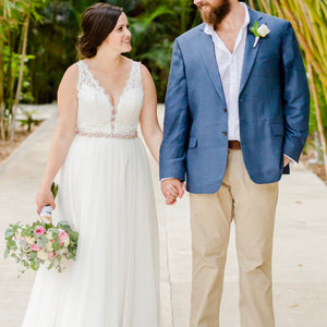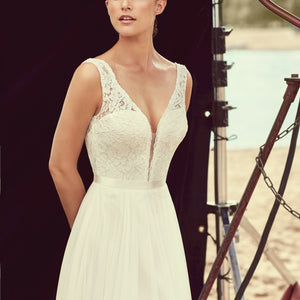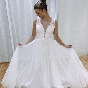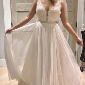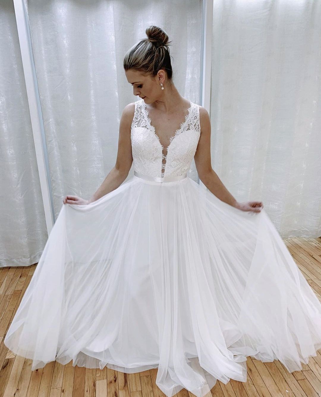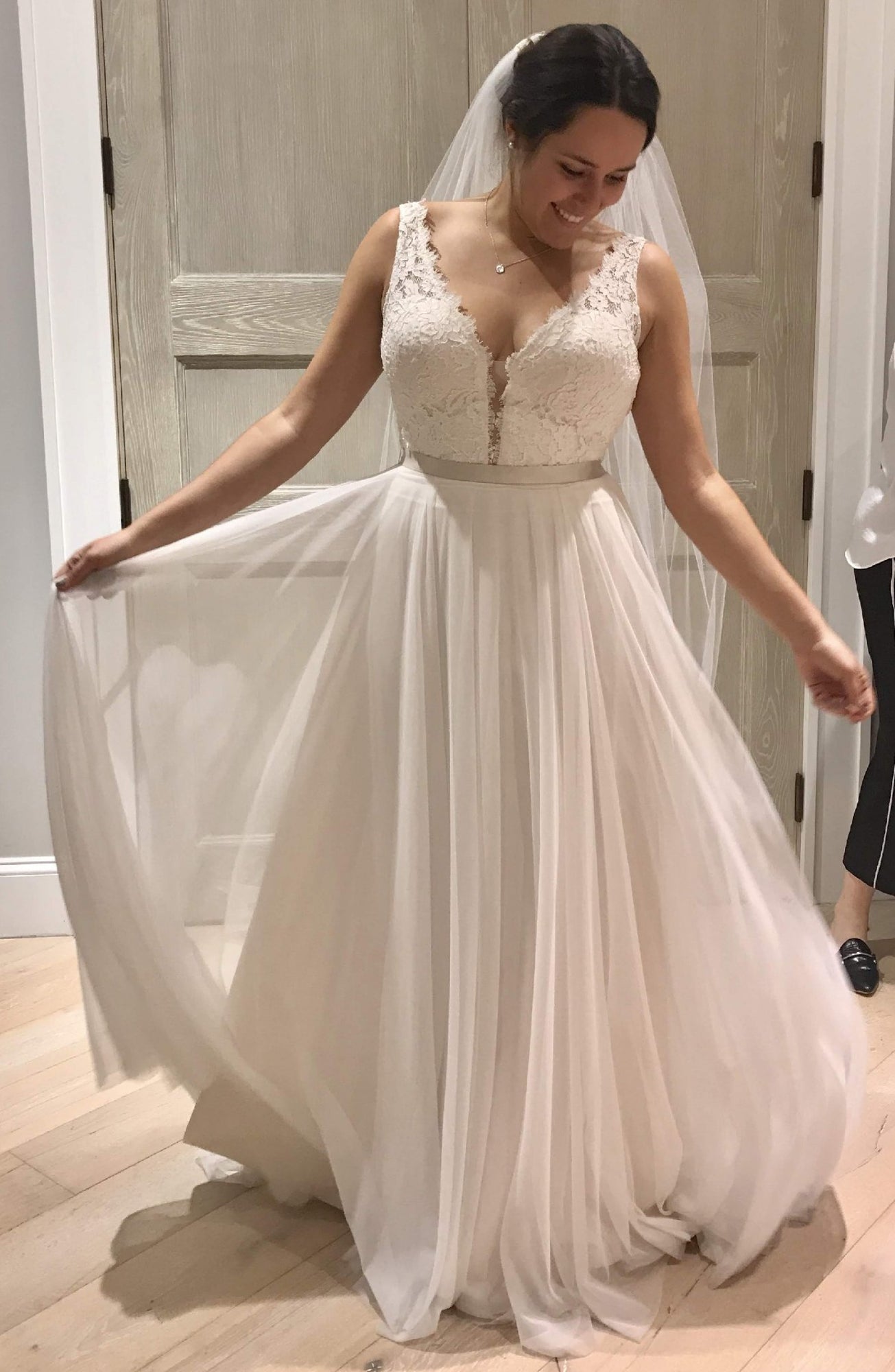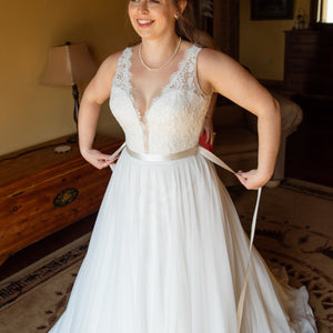 Mikaella Lace and Mesh Tulle Wedding Dress. Plunging neckline bodice in Mikaella Lace with scalloped edging.  Eyelash Lace Scallop along the front and back neckline.  Does NOT come with removable ribbon at waist.