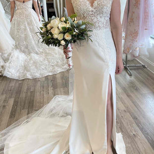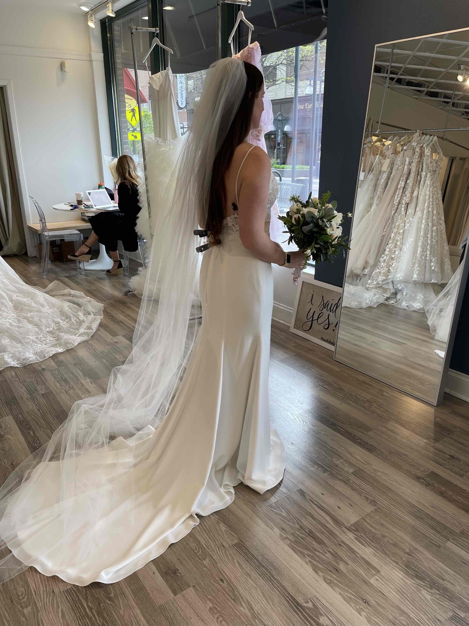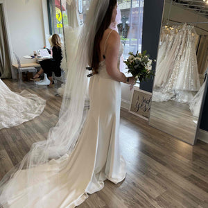 Has been tried on in store, but appears to be in like new condition. Very minor dust along the hemline (not an issue since most brides will need to shorten the dress). Retail price: $2,650.