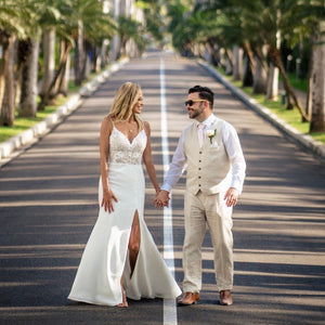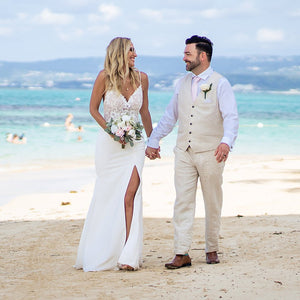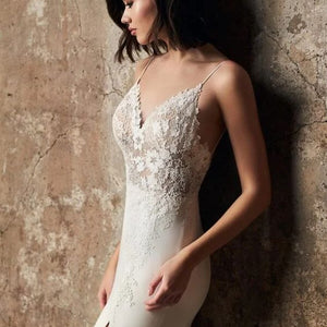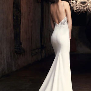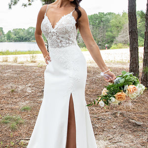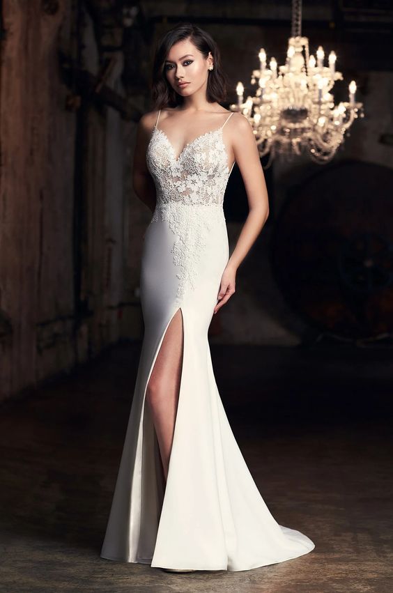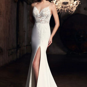This feminine straight-cut gown is elegant and classy. The Chantilly Lace bodice features the most delicate lace appliqué that extends from the bodice down to the side slit in the front and along the center back of the dress. The back of the gown has a flattering low cut with simple spaghetti straps. The fit-and-flare skirt accentuates your figure giving you a slender silhouette. Color: Natural.