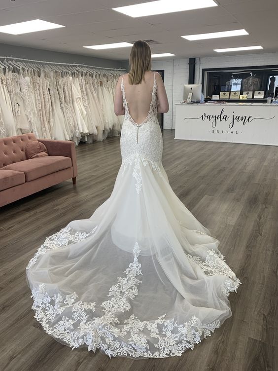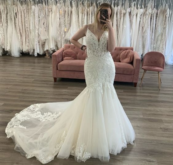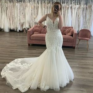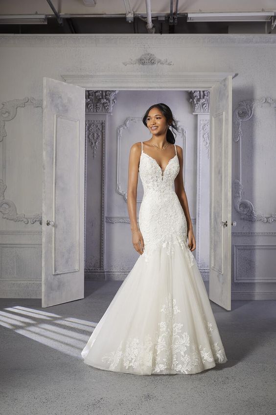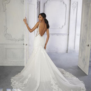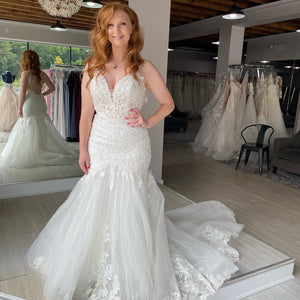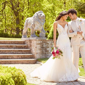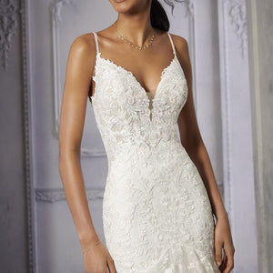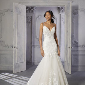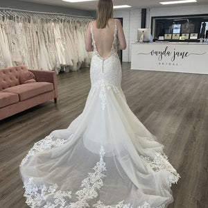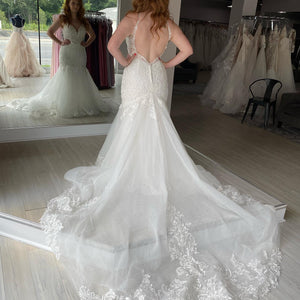 Magic in a dress, the Chantal designer wedding gown is a true mermaid with romantic flair. The sweetheart, v-neck bodice is covered in intricate frosted medallion, lace appliqués, and hugs each and every curve. We didn’t forget the sparkle with crystal beaded straps and tulle over sequined Chantilly lace bodice. A racy, low back adds a sultry touch and a romantic sheer train, edged in lace completes the look. Color: Ivory/Champagne/Honey.