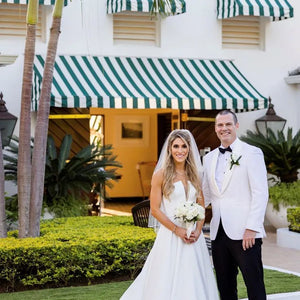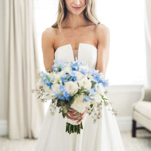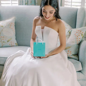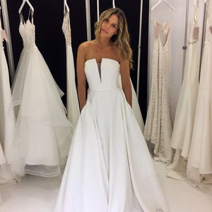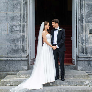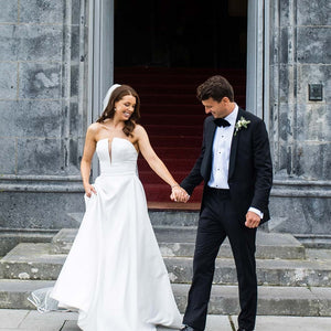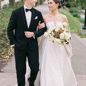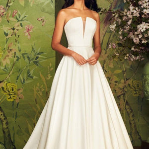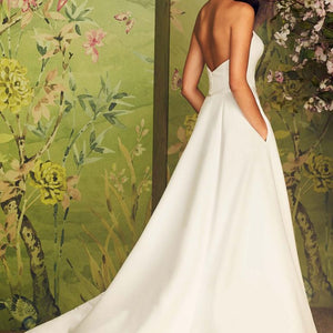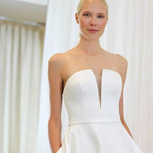 A black-tie wedding gown for the modern, classic bride. The waistline is designed to be slimming and flattering. Chic strapless plunging notched neckline. Elegantly exposed back with a stunning silhouette. Strapless Satin Faille gown with plunging notched neckline. Satin Faille belt at waist. Open back. Full circle skirt with pockets.