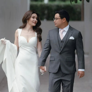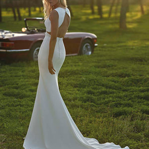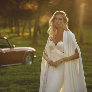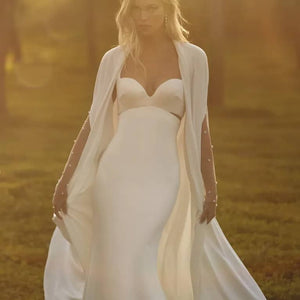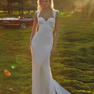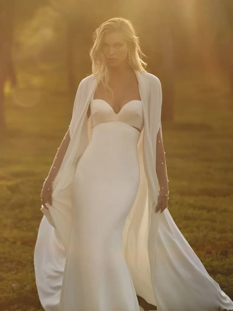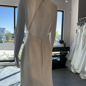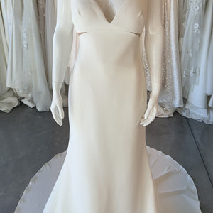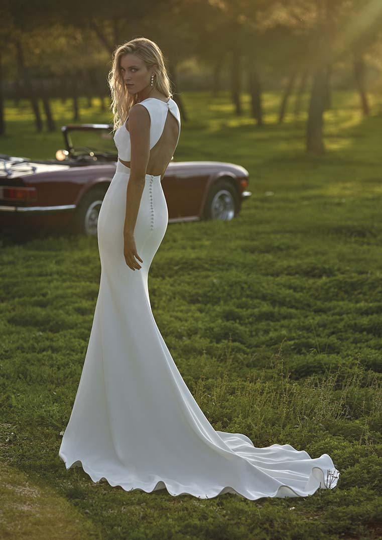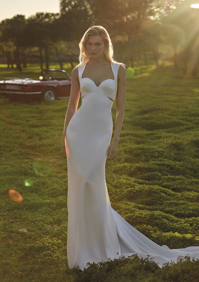 The Aman gown by Pronovias is a simply a show stopper! Aman is a Mermaid crepe wedding dress with sweetheart neckline. This fashion-forward gown combines a minimalist mermaid style with daring geometric forms and on-trend keyhole back. Add sheer gloves or a cape to add glam and versatility (not included). In slinky crepe.