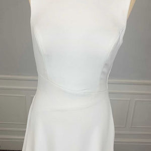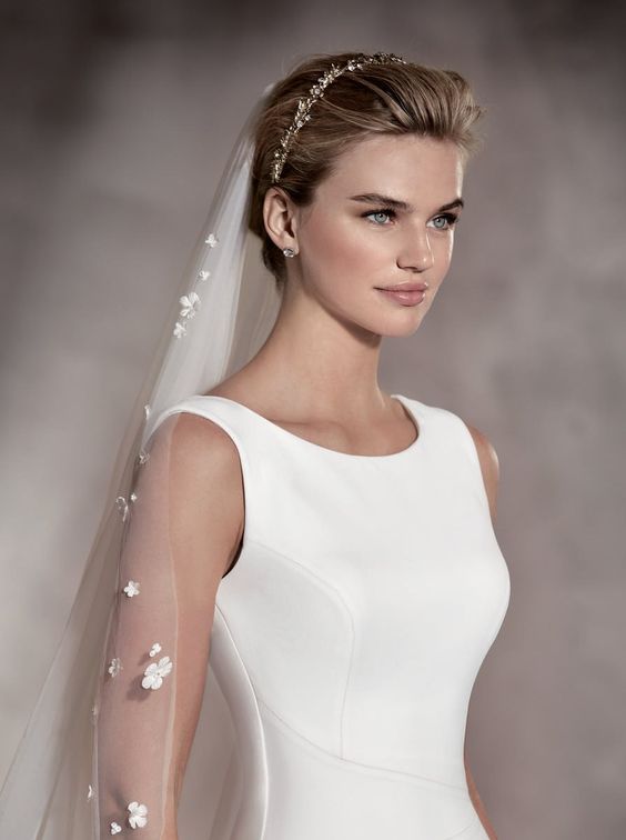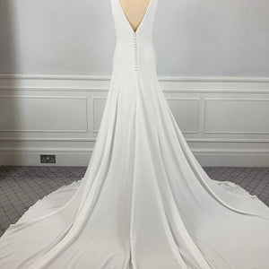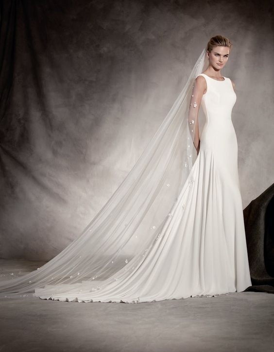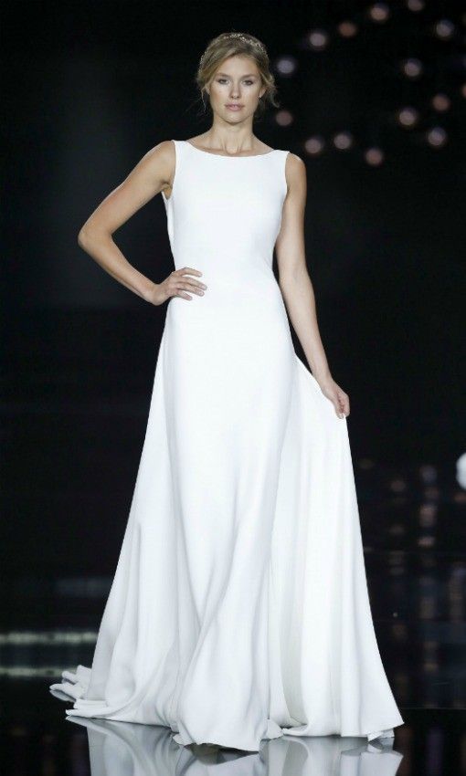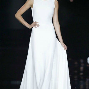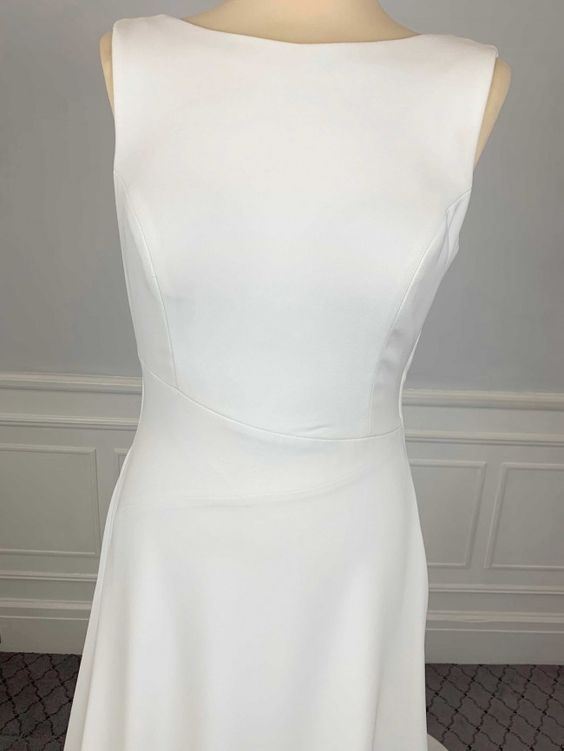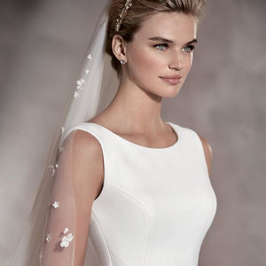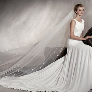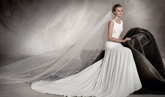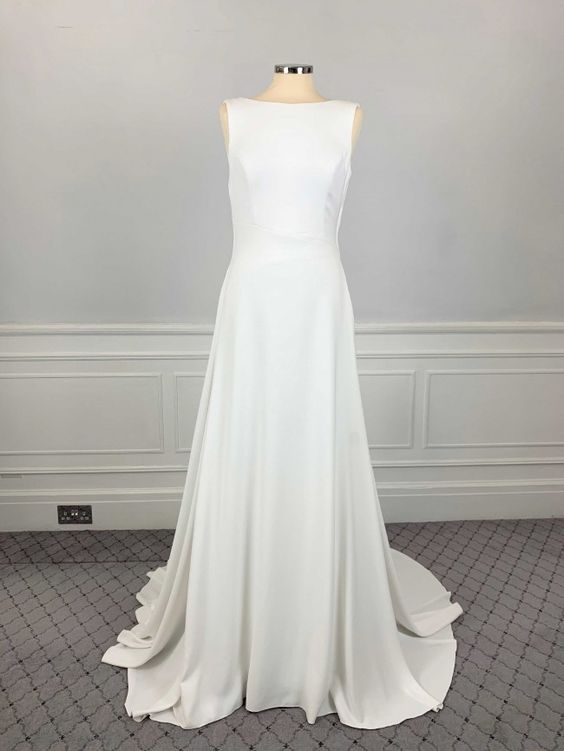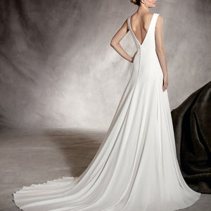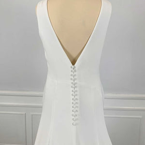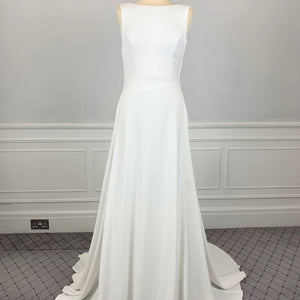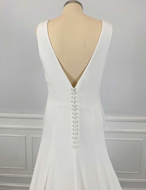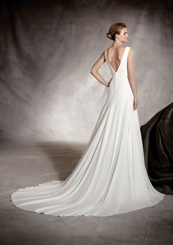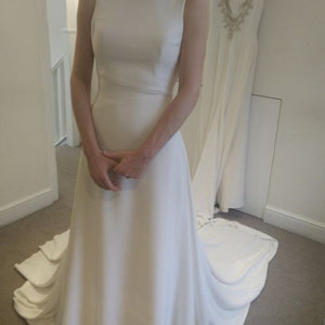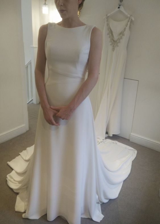 A timeless, elegant Pronovias low backed dress made of crepe with a jaw-dropping long train. The cut of the front of the dress is extremely flattering and draws attention to the waist. The lack of bodice makes the dress so much more comfortable than your average wedding dress, but it still feels supported as there is an elasticated band which can be drawn across the back under the dress. It doesn't feel heavy to wear, even though it has a long train which makes for a dramatic effect and can be draped to the side for photos. Fitted at the waist A line made in crepe with a flared out bottom.