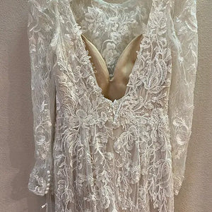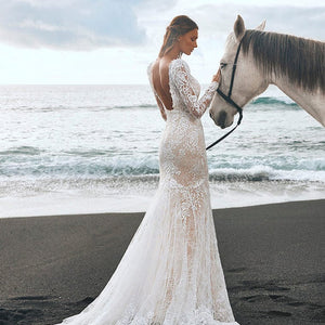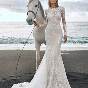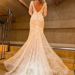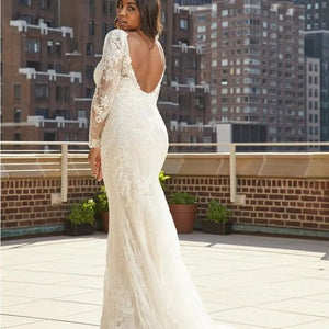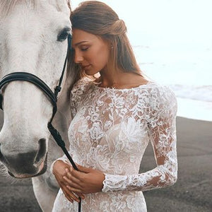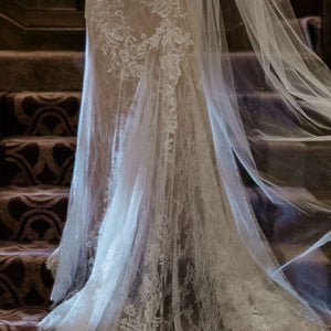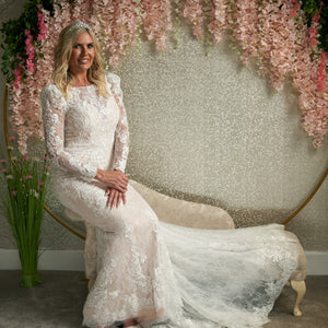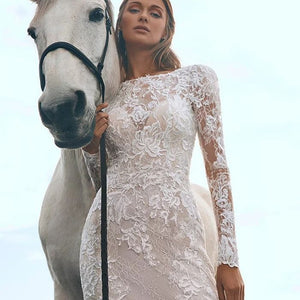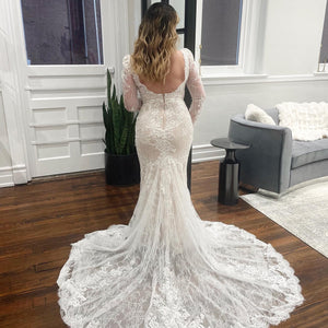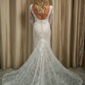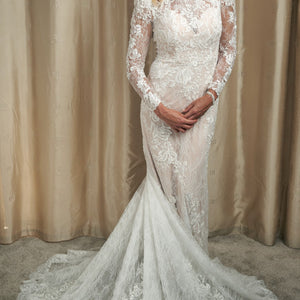 An elegant mermaid gown crafted in rich Chantilly and a soft layer of tulle on the skirt. With a chic boat neck and long sleeves, making this dress perfect for wintery weddings. Lace applique elevates the inherent texture of the Chantilly lace, while a plunge back and invisible closure creates a smooth silhouette that appears to envelope the body. Color: Off white/ Nude.