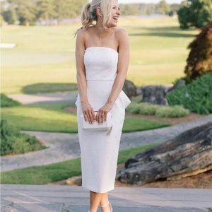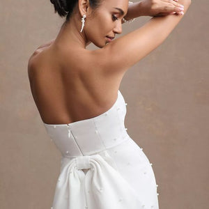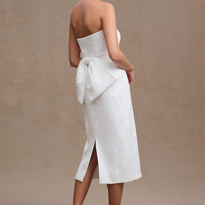 The image of class and sophistication, the Sachin & Babi Gemma Midi Dress is playful while remaining elegant. A strapless midi column silhouette, it's dotted with all-over pearl embellishments, and finishes with a stunning back bow and back slit.