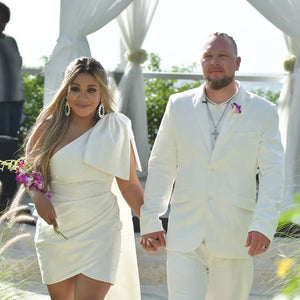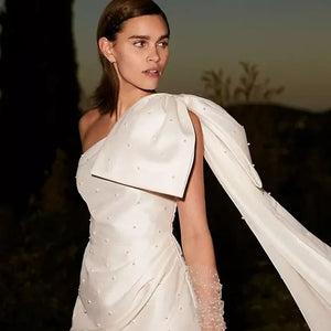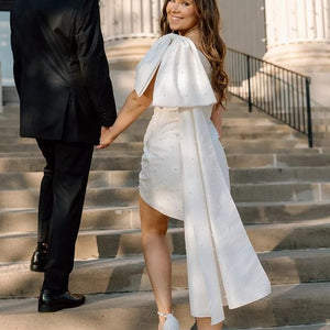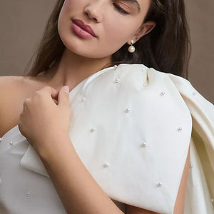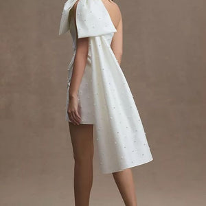 The Sachin & Babi Pippa Mini Dress is the perfect show-stopping number for every bridal occasion. This mini silhouette is made of a silky dupioni fabrication. A wrapped front and dramatic one-shoulder neckline with a bow sleeve are dotted with stunning droplets of beautiful pearls - finishing the look with a sea-inspired touch.