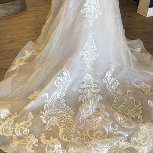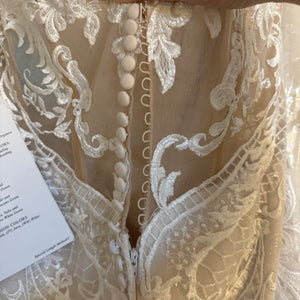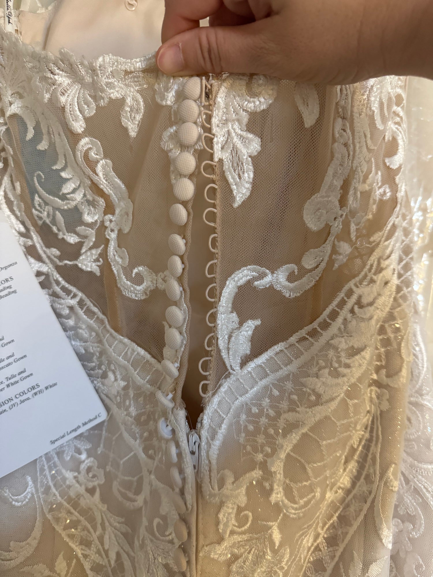 Has been tried on in store and has a few pin-sized holes in the tulle on the back of the dress. See last picture of the dress. Not noticeable when worn. Overall in excellent condition. Retail price: $1,650.