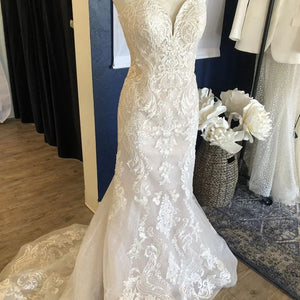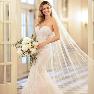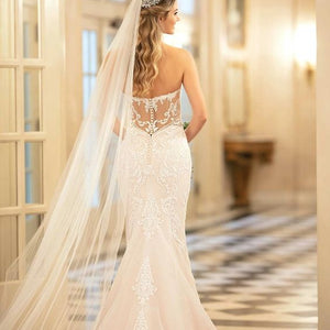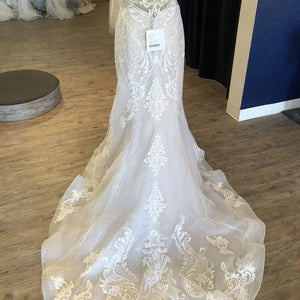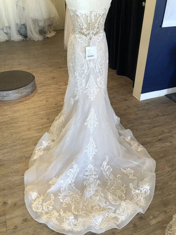 Understated glamour, maximum beauty. This stunning fit-and-flare silhouette from Stella York is a sheer masterpiece! A classic strapless sweetheart dips into a subtle plunge, masked with illusion tulle for coverage. A mix of graphic and floral laces create a truly extravagant feel throughout, offering a negative space effect for texture and dimension. The laces are placed about the bodice to enhance the curves, while also reaching over angled side cutouts which draw in the waist for a super-defined figure. The sheer back element ties it all together with exposed boning for a sexy corsetry feel with floating lace appliqués for a surprising yet decadent touch. This gown zips beneath fabric-covered buttons.