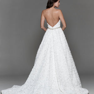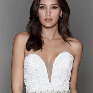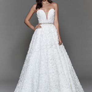 - Ivory strapless and sleeveless ballgown with an illusion neckline,