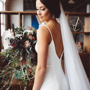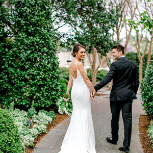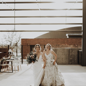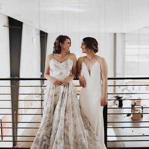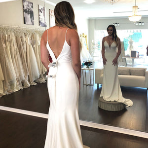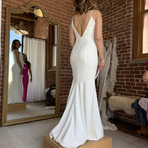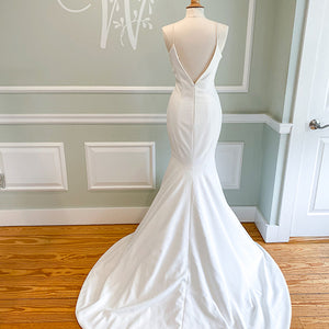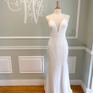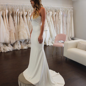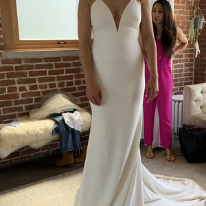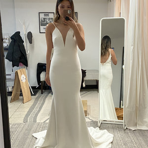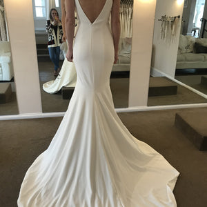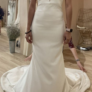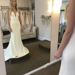 Size 12. This gown has been tired on in store and has minor dust along the hemline. Otherwise in like-new condition. Never worn outside the salon and never altered. Retail price: $1,450!