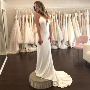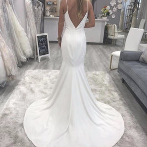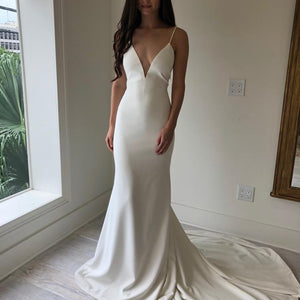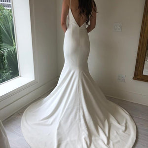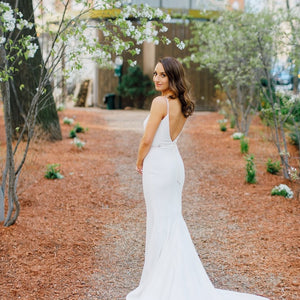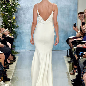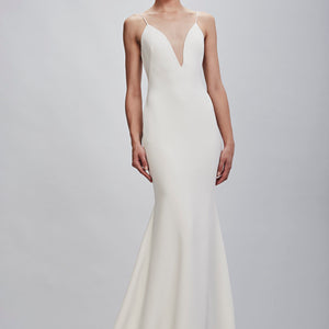 Sleeveless illusion deep v plunge stretch crepe mermaid flare gown.