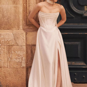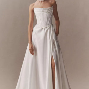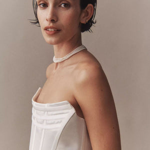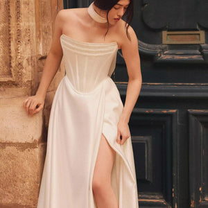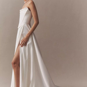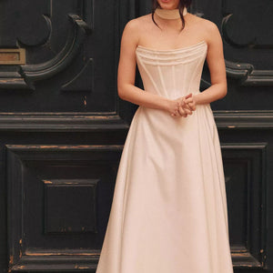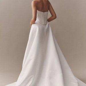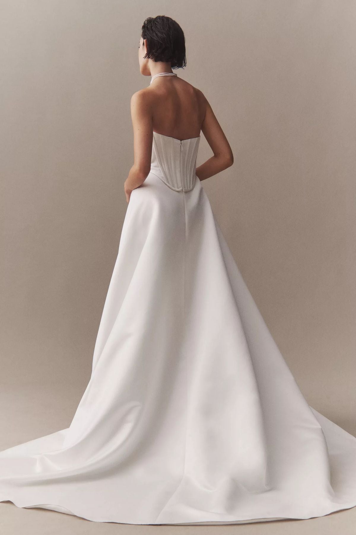The enchanting Watters Allie Gown is the epitome of modern romance with a nod to timeless elegance. Its strapless, corset bodice cinches at the waist, sculpting a figure-flattering silhouette that gently flows into a luxuriously full satin skirt.