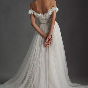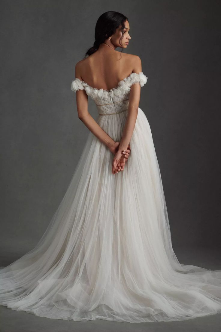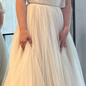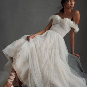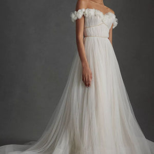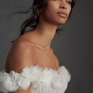 Float down the aisle in the gorgeous Watters Corrine A-Line Wedding Gown. A floaty tulle silhouette makes a statement with an airy skirt, trailing into a chapel train. Finished with a corset-style bodice and ruffled, off-the-shoulder neckline and sleeves, it's a pick fit for a princess.