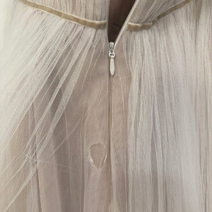 Has been tried on in store. One small hole in the tulle on the back near the base of the zipper. A seamstress can stitch it up with clear thread. Please see last picture. Retail price: $1,900