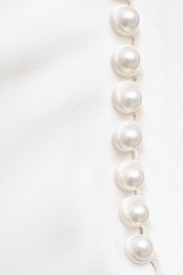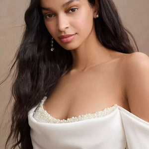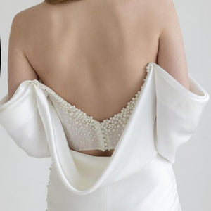 The Garance gown is daring and chic. This Polished satin sheath is draped to intrigue with exposed corsetry and just the perfect touch of demure. We finished the corset with hand-beaded pearl details for added drama.