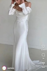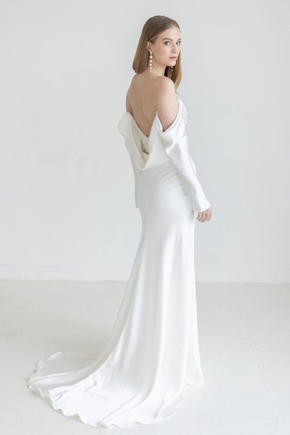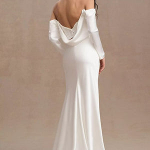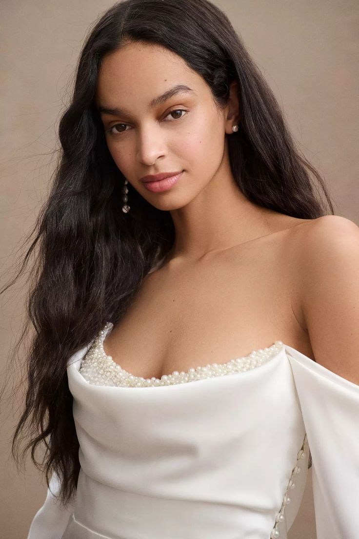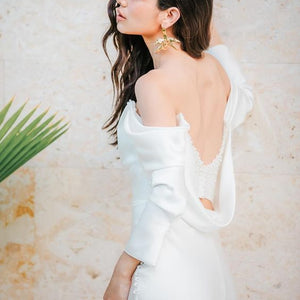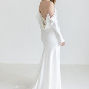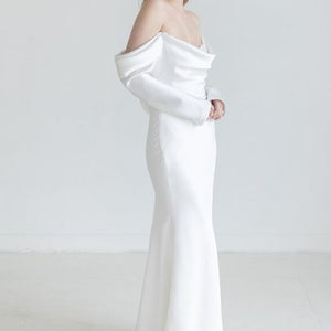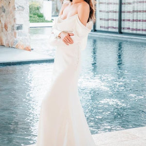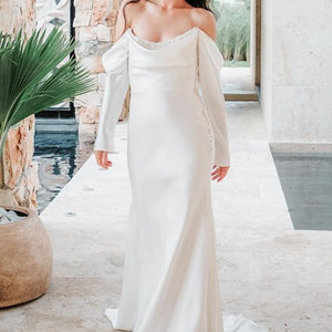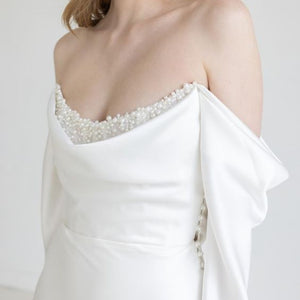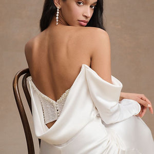 The Watters Garance Wedding Gown is distinguished by long, elegant, off-the shoulder sleeves that gently drape and cascade along the length of your arms. Finished with pearl detailing, a corset-style back, and a long, sweeping train, this sheath gown was designed for the glamour-chic bride.