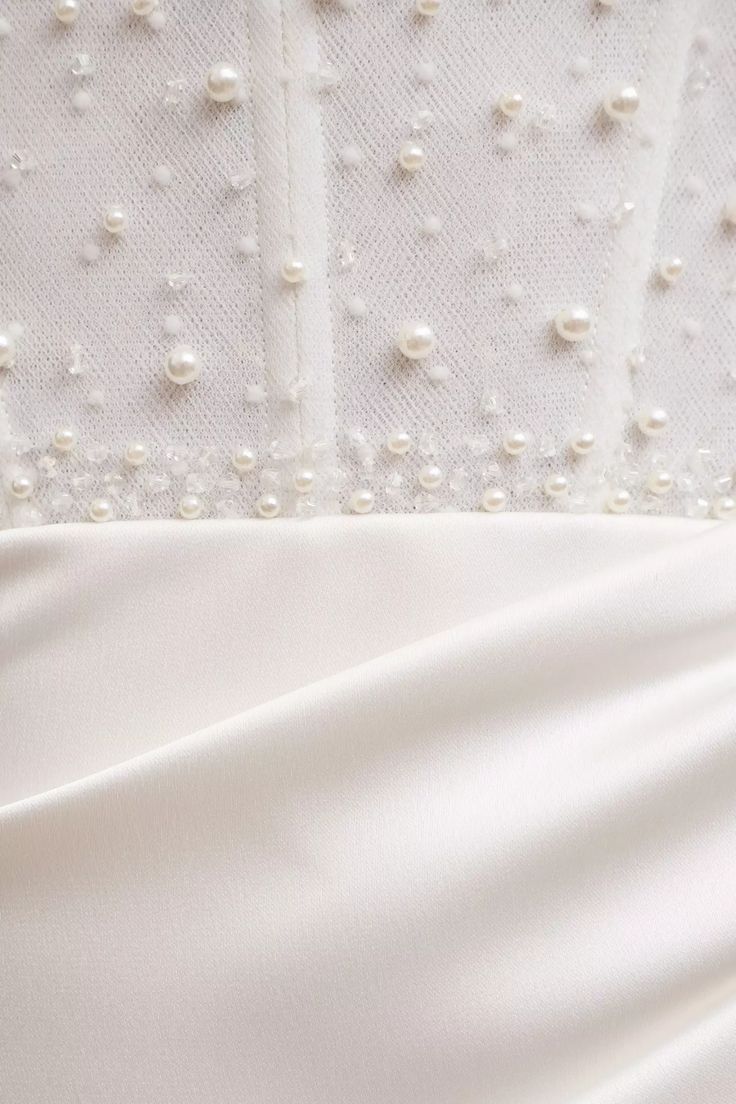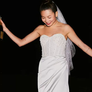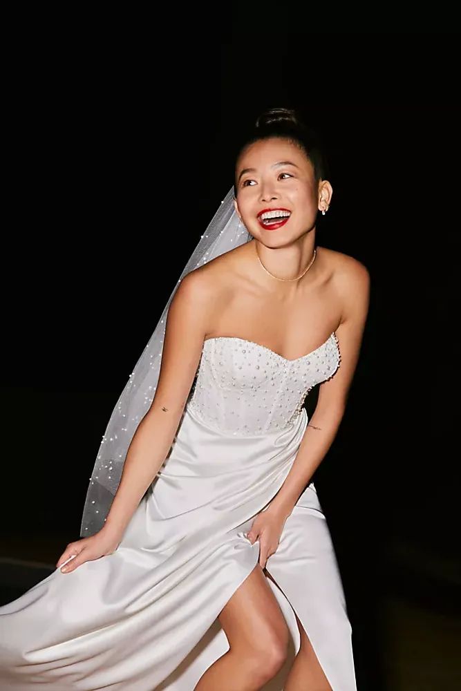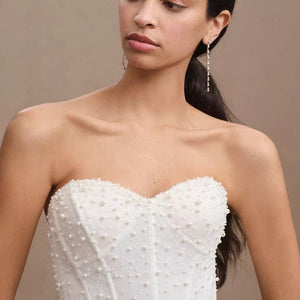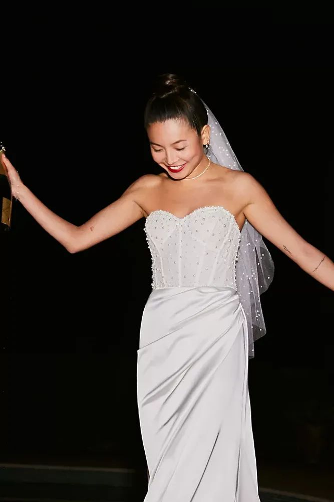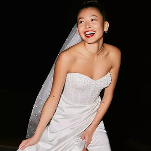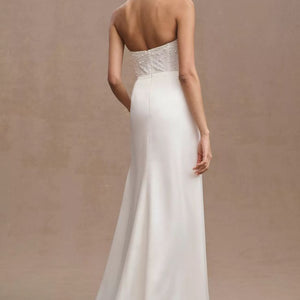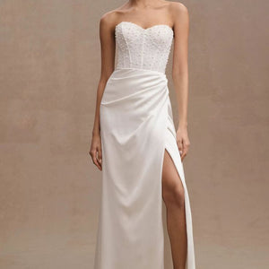 Textured and timeless, the Watters Tilly Wedding Gown is mesmerizing with its beaded embellishments and alluring corset bodice. The front twists into a wrap style, resulting in a chic slit to show off wedding day heels.