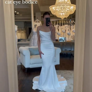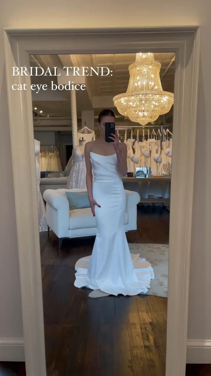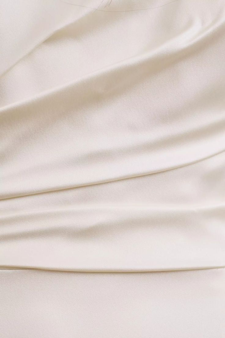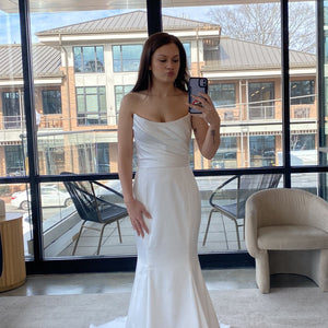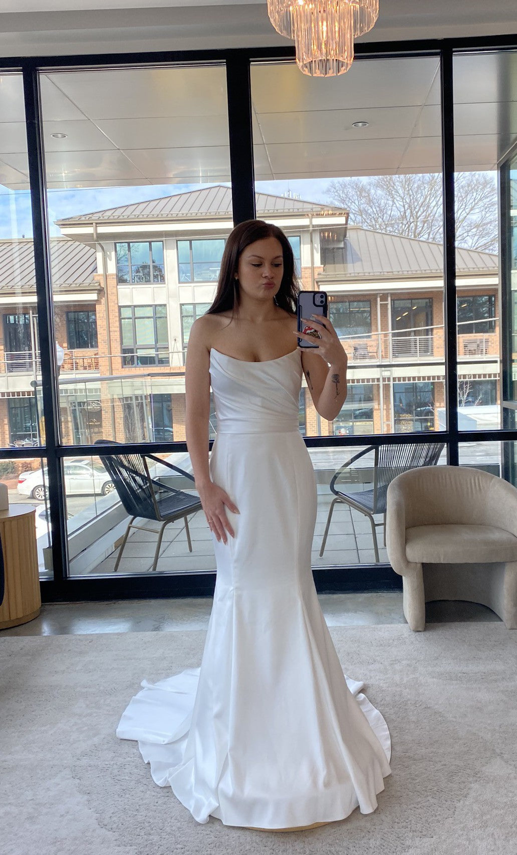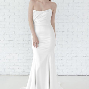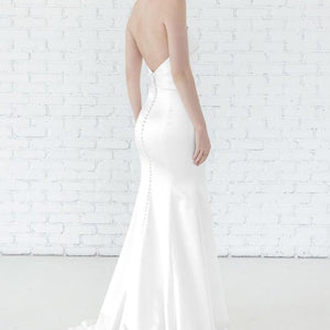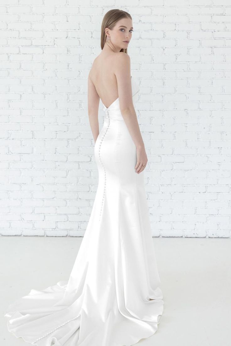 Featuring a draped, strapless bodice and finished with satin-covered buttons, the Elynor Wedding Gown stuns with a low back and elegant train.