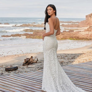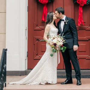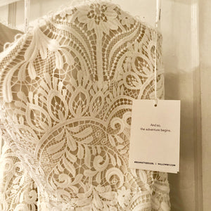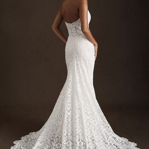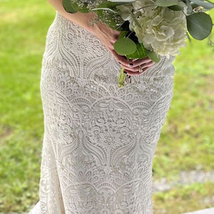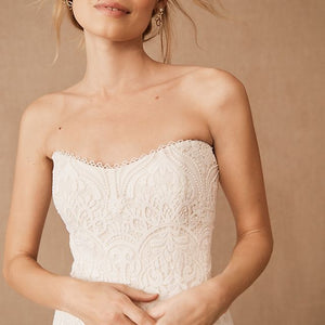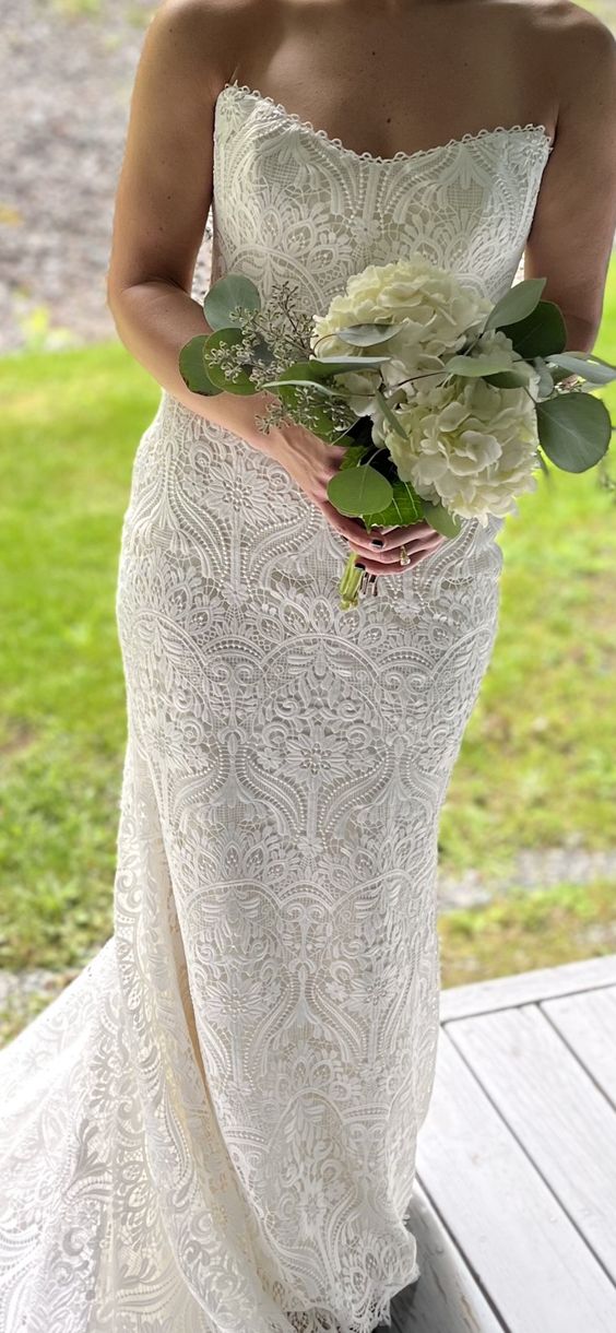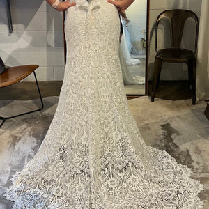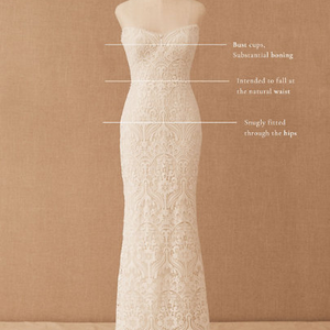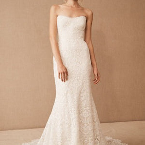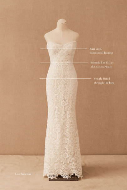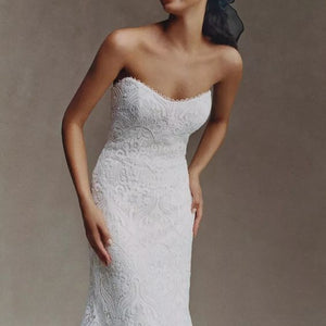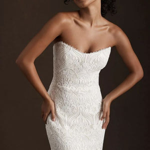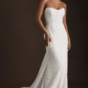 The Willowby by Watters Yesenia Wedding Gown is a classic sheath silhouette coated in graphic lace, gently cascading into a sweeping train. A corset bodice provides a flattering fit while a strapless neckline allows you to accessorize to your heart's content. Fully adorned in textured charmeuse, the piece is finished with subtle eyelet detailing along the sweetheart neckline.