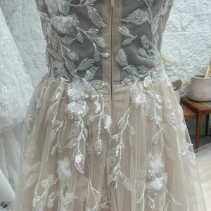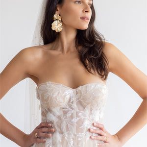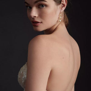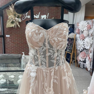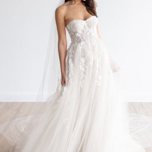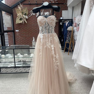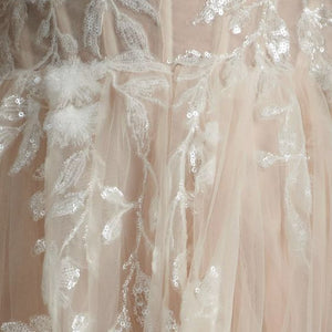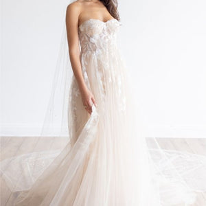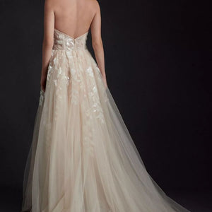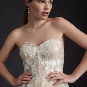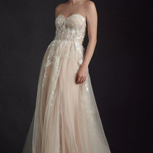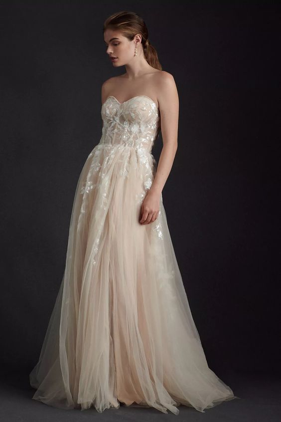 Isn't it romantic? Tiers of tulle, a sequined floral motif, and a classically corset-inspired strapless bodice define the Wtoo by Watters Austin Tulle Wedding Gown. Rendered in beige, almost blush, tulle, it offers an unexpected bridal look. Finished with a full train, shining floral details, and a low open back, it makes for an enchanting pick. Color: Oatmeal.