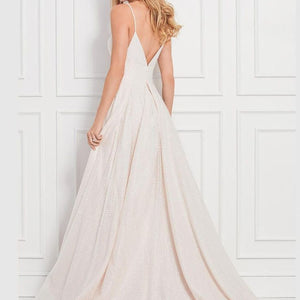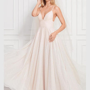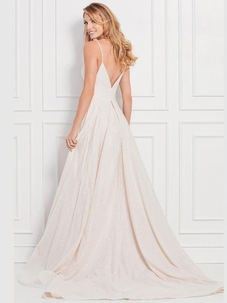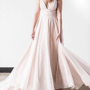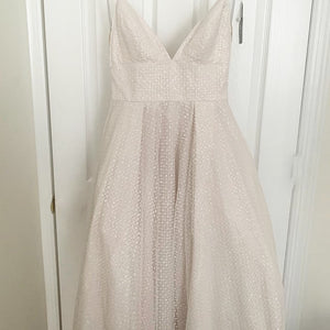 WTOO Britton 12601 is a sparkly tulle ball gown featuring a geometric pattern throughout! This blush colored Wtoo Britton ballgown wedding dress is made with Luciu glitter fabric as the top layer, illusion tulle along the side to connect the bust to the back of the dress, and a poly lining. The dress has a beautiful chapel length train that can be bustled at the waist for easier movement. This beautiful dress sparkles and makes a great statement!