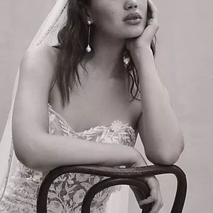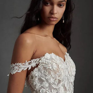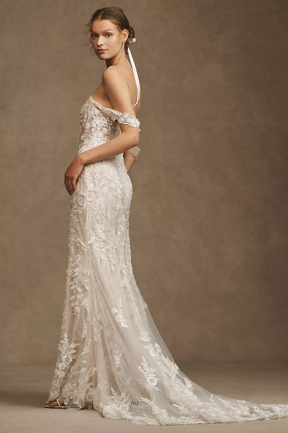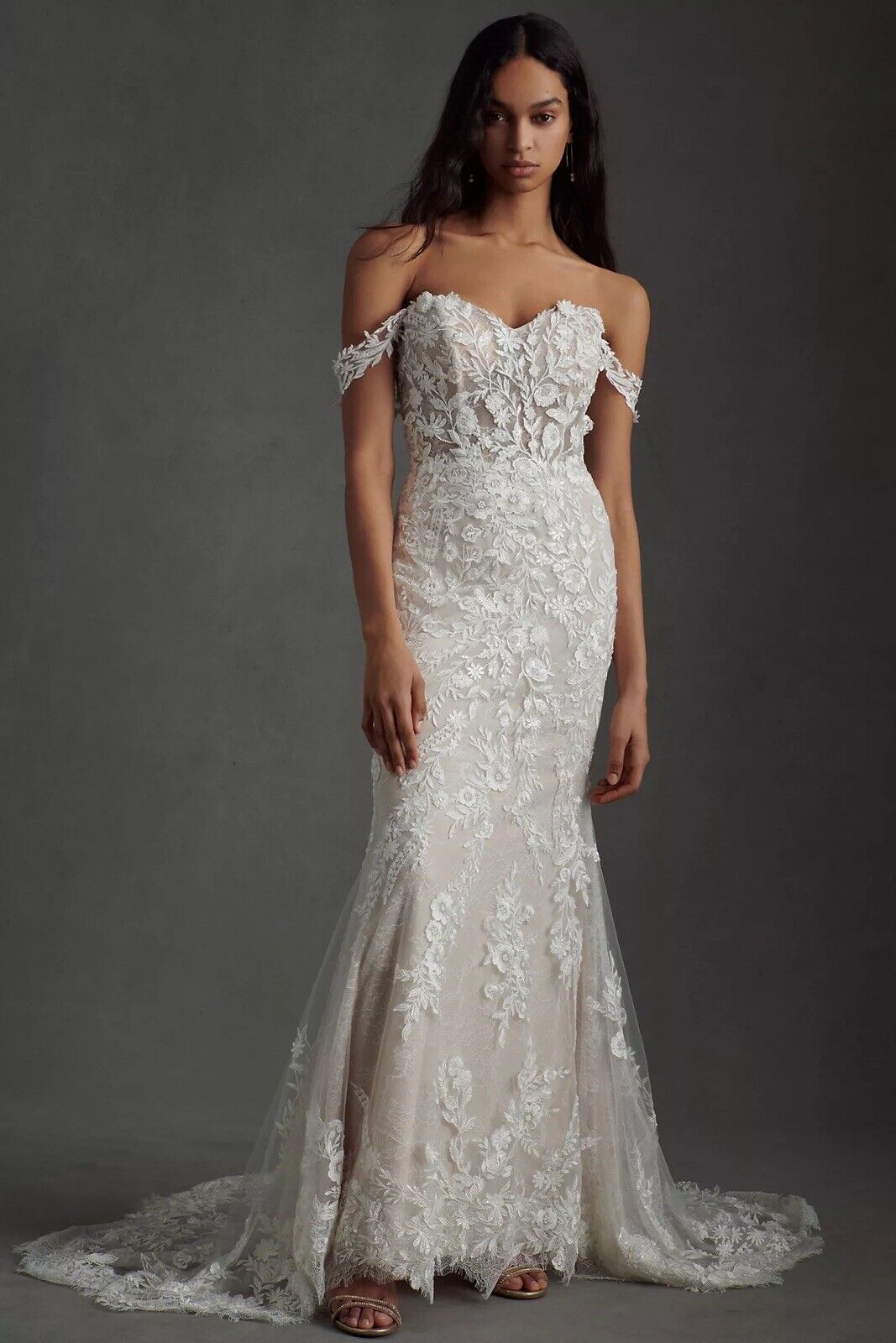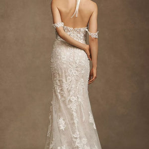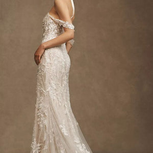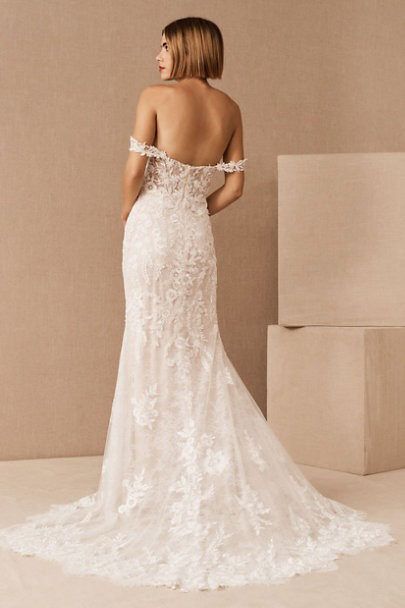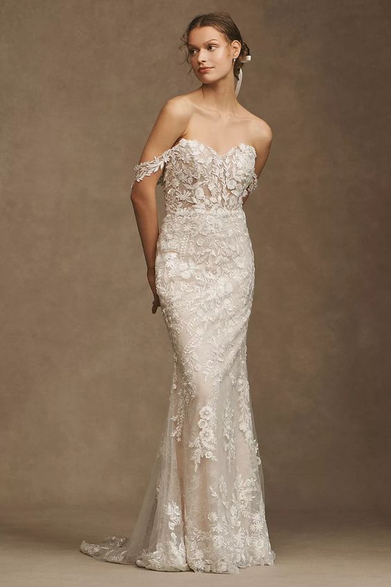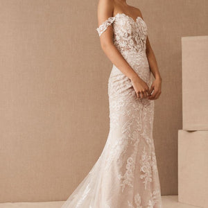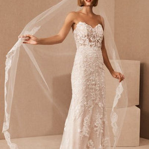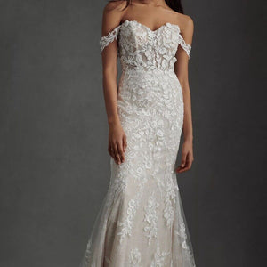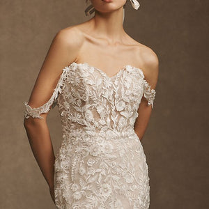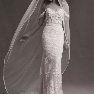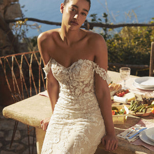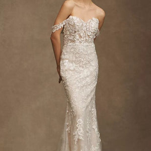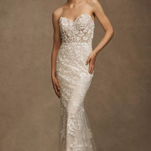 Intricate lace coats the flawlessly fitted Wtoo by Watters Bettina Wedding Gown, adding a layer of enchanting detail from the sheer corset bodice to the sweeping train. Removable sleeves offer two romantic looks in one, lightly draping to the side of the structured sweetheart neckline. A fitted silhouette slightly flares into a mermaid shape, highlighting the stunning floral details.