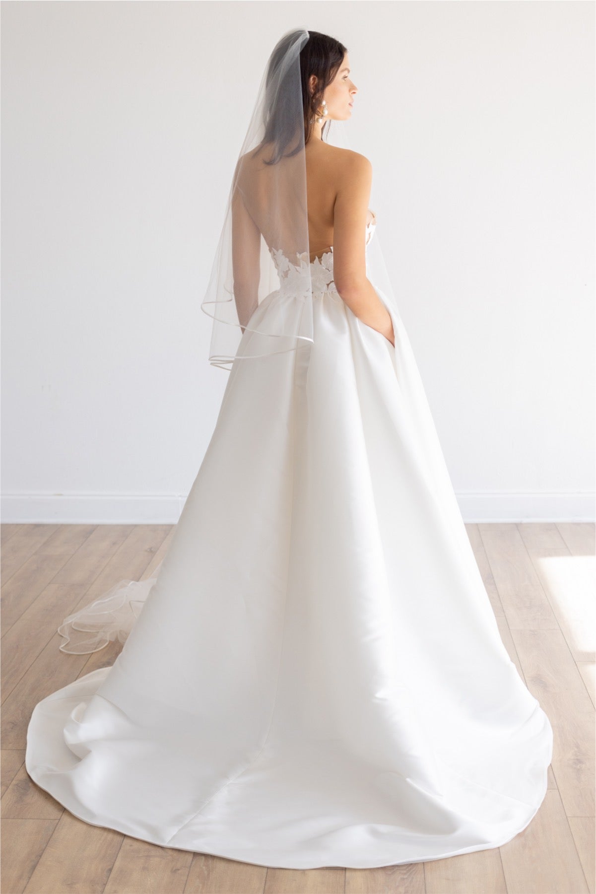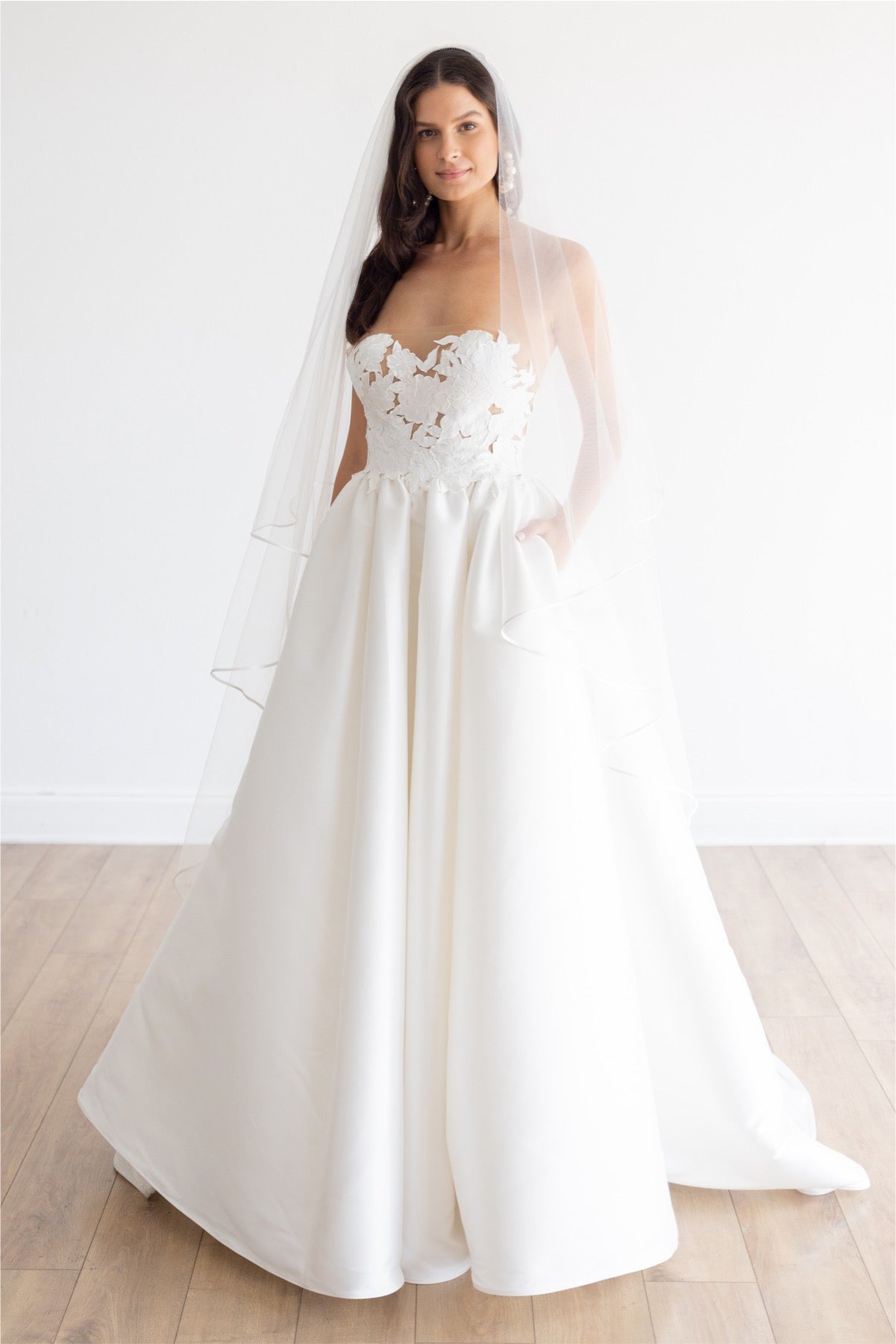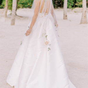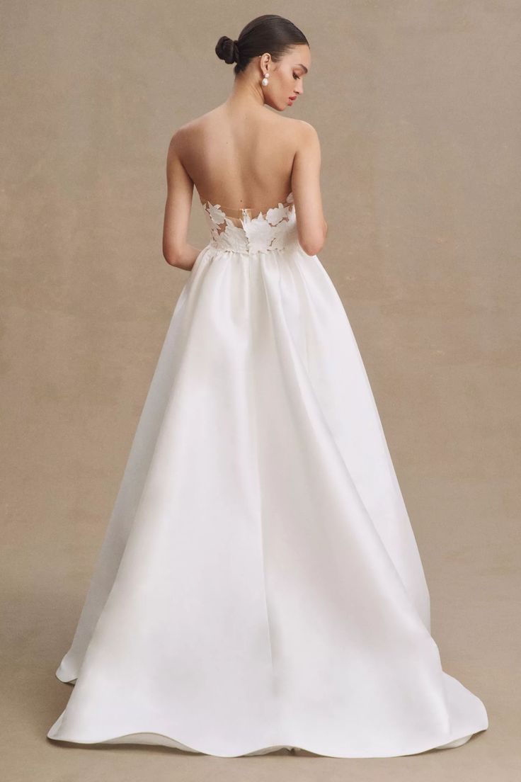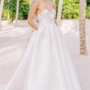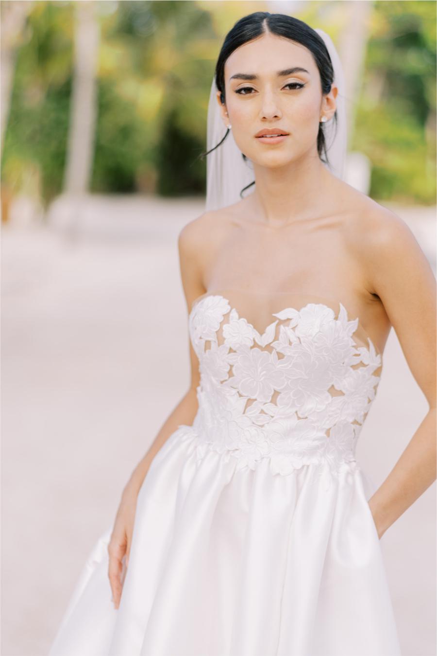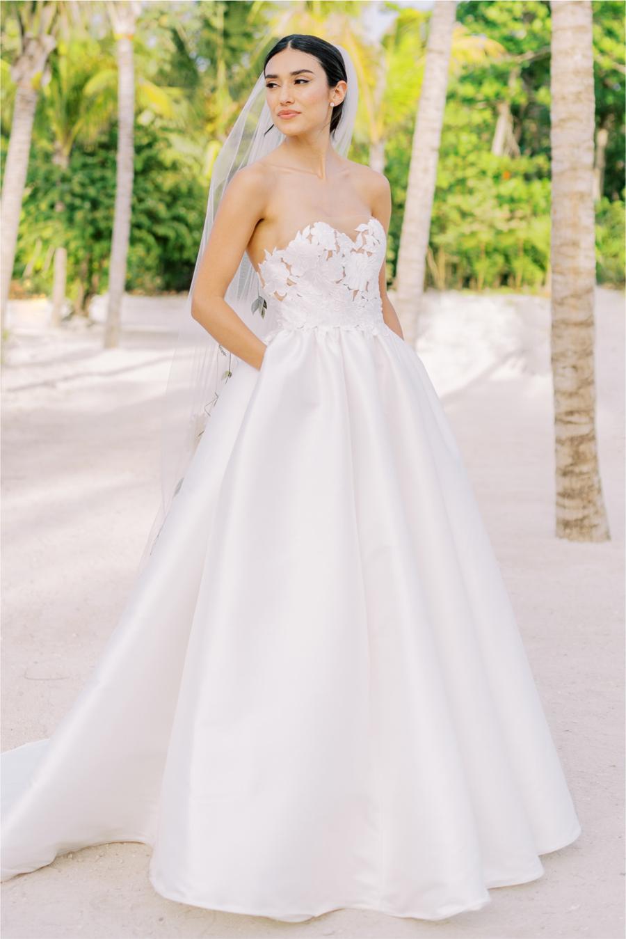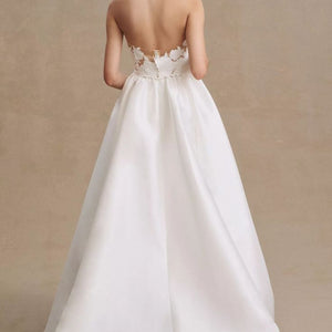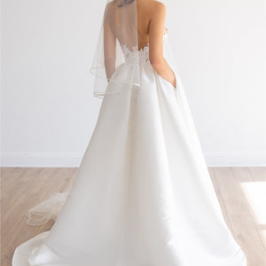 As graceful as a swan, Jordy brings a modern twist to a classic material; the pleated Mikado creates an elegant taper from the floor, up to the waist, giving way to the structured floral bodice. We cut away Mikado to create a custom lace using negative space and illusion for added dimension. A stunning sweetheart adds a touch of whimsy to the formal look, making it a gown to be worn in any venue.
