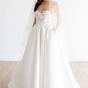 Featuring an illusion cutwork bodice and a full skirt, the Jordy Wedding Gown pairs a classic silhouette with dreamy, intricate detail.