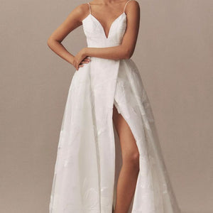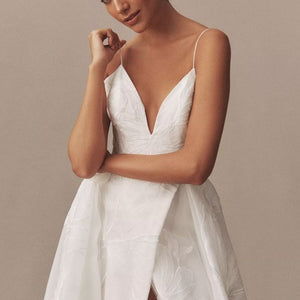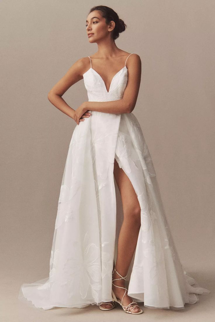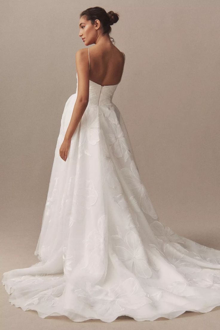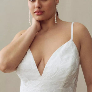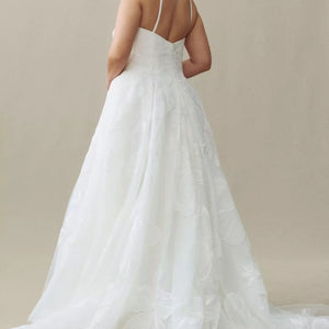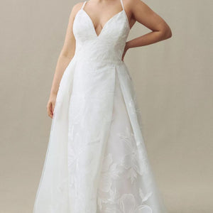 Both classic and on-trend, Romy's corset commands attentions with its eye-catching structure. The bodice beautifully contrasts with the billowing organza train, adding a touch of modern flair to timeless elegance.