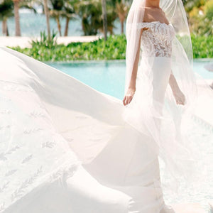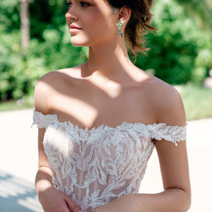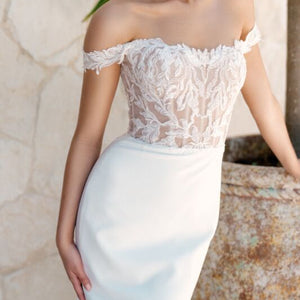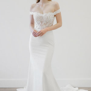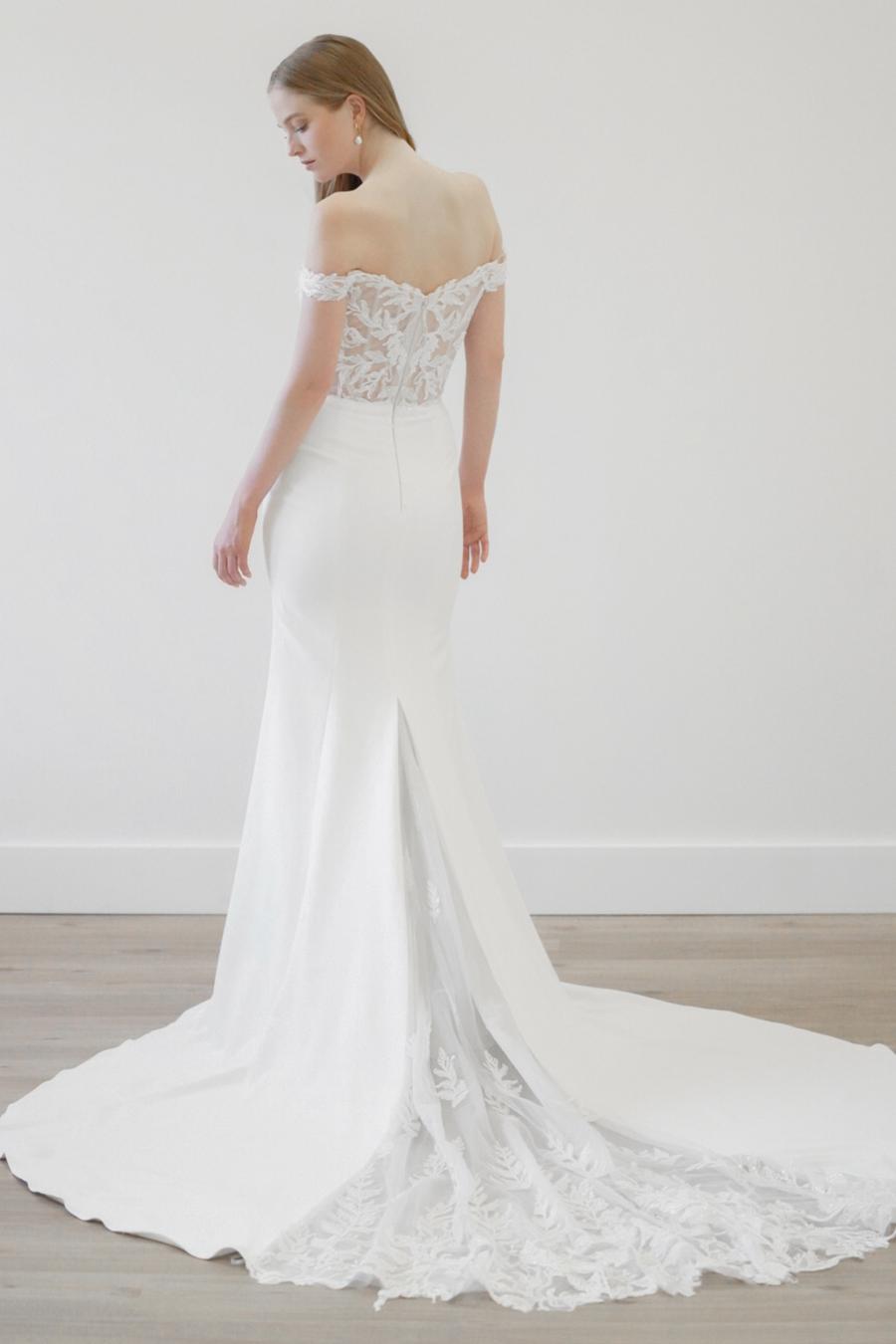Graphic and modern Willow leaf lace dances off-the-shoulder in this romantic gown. The Olero gown pairs dreamy lace with a clean and classic skirt and is tied together with a peekaboo godet of lace. Style #11823.