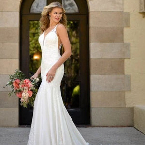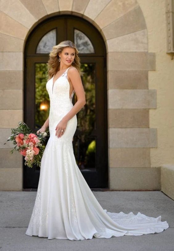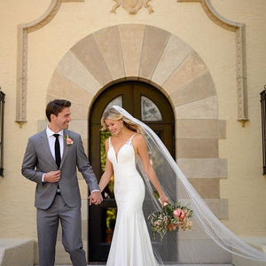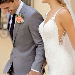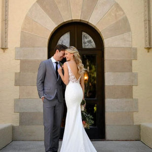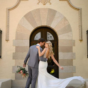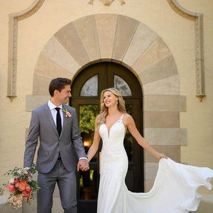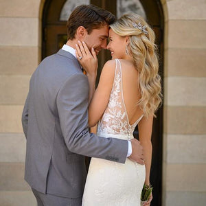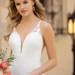 For the modern bride with a bit of a softer side—we have just the thing. Allow us to introduce Style 7078, the perfect blend of chic, modern style with a subtle hint of sexy and all of the romance! The gorgeous V-neckline narrows toward the center to flatter the figure, while the clean curve along the plunge and wide straps feature soft beadwork for a beautiful shine. Mirrored by a defined, open V-back and V-side cutouts, you won't believe your eyes when you see your figure come to life in this silhouette. The V-back is framed by sheer paneling and organic-inspired lace appliques creating a tattoo-lace illusion. Not quite a fit-and-flare yet not quite a sheath silhouette, the supple crepe fabric flows over the body effortlessly for an updated yet casual feel. Finally, this gown is finished with soft shimmer elements and floral lace appliques over the crepe fabric—creating a unique, multidimensional look you'll simply have to see in person to believe!