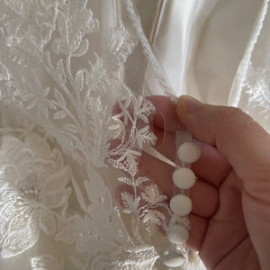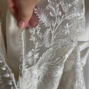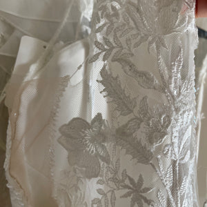 Has been tried on in store and has a few small holes in the tulle on the back area near the buttons (see last pictures of actual dress). Also some missing beads in the armpit area. Price has been reduced accordingly. Retail price: $1,526.