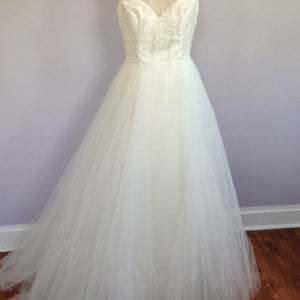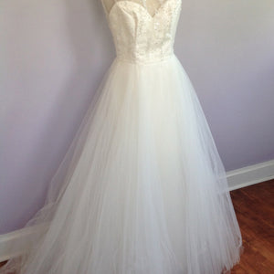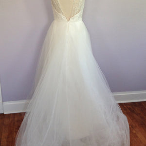 Ivory Mikado organza trumpet gown with A-line tulle overlay, beaded illusion tulle bodice over sweetheart neckline. Chapel train. Does not come with the belt as shown in the stock photos.