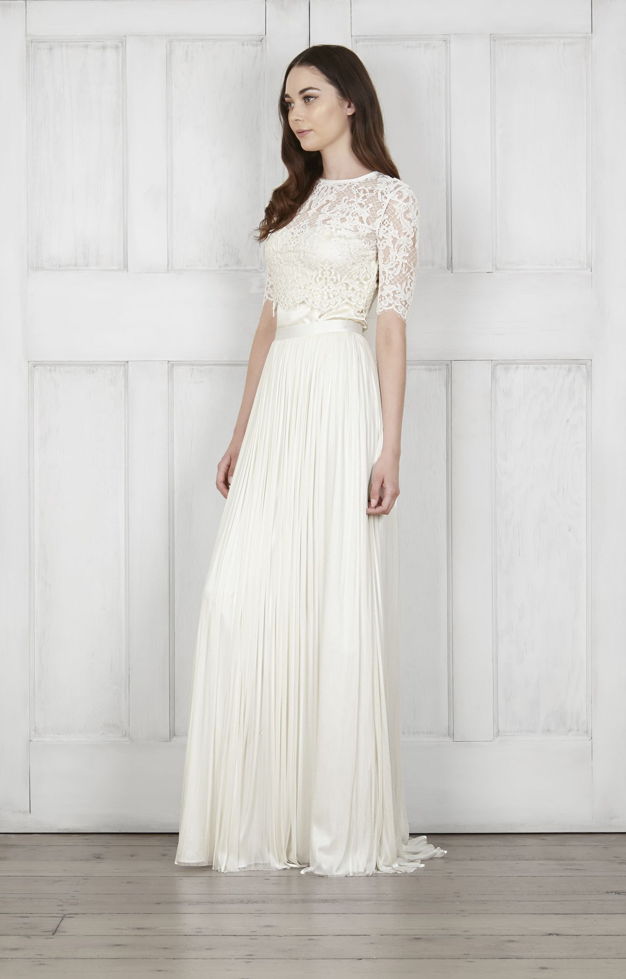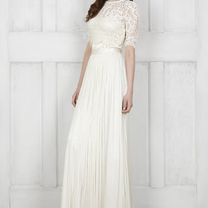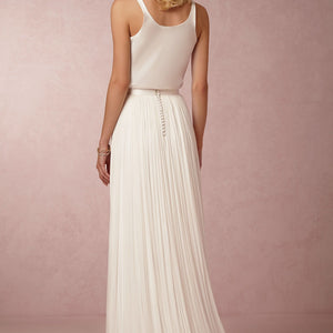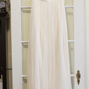 Gracefully pleated ivory silk tulle flows from the satin waistband to the toe-skimming hem of this exquisite skirt.