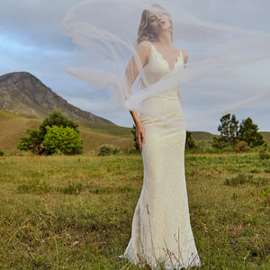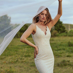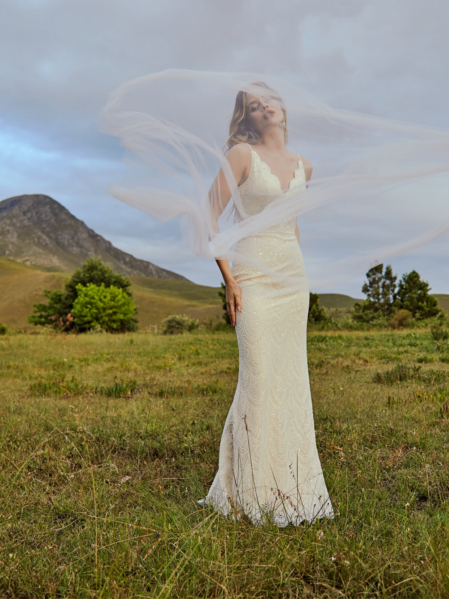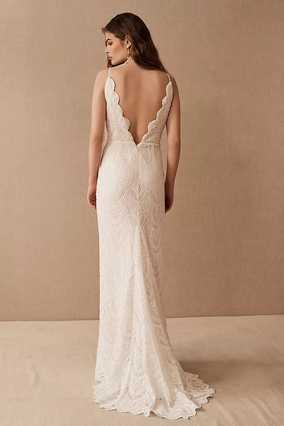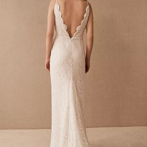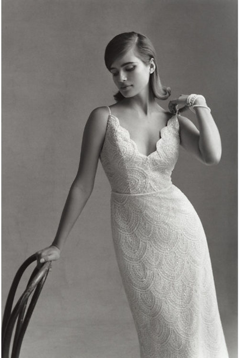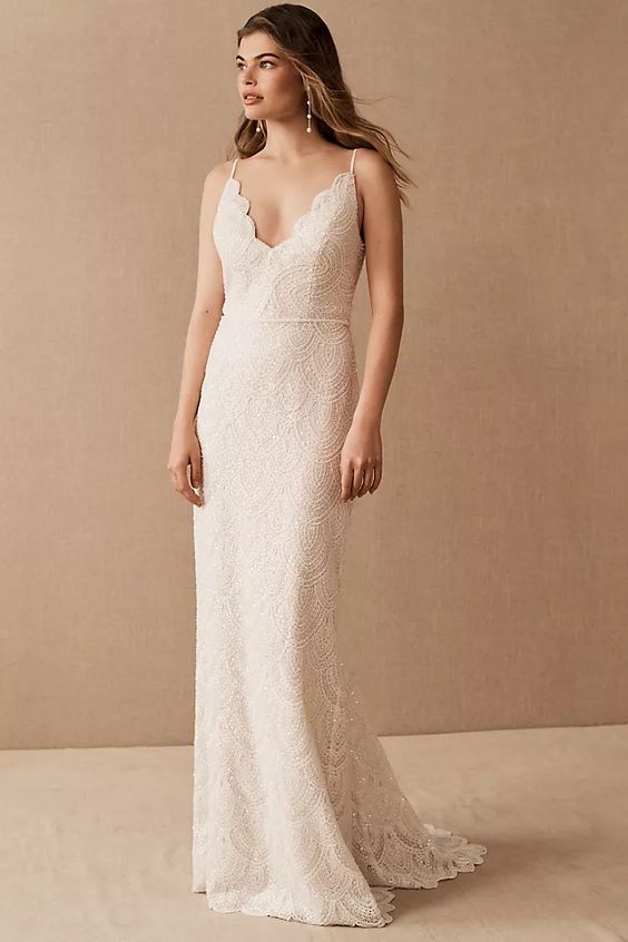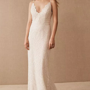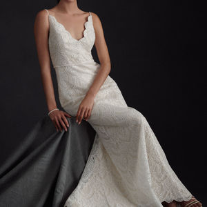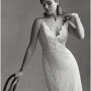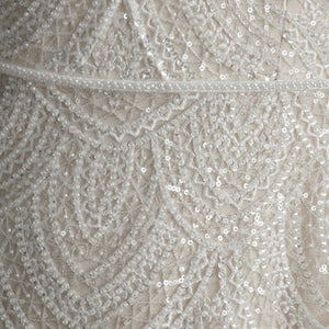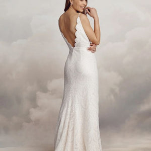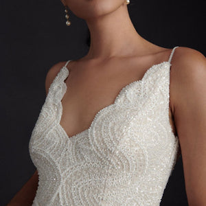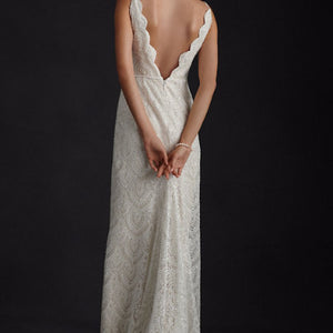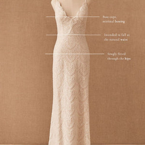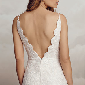 This sleek champagne gown featuring beaded lace and a classic silhouette is perfect for the bubbly bride. Crafted from exquisite beaded lace, the Wesley gown is an elegant and timeless silhouette. This floor-length gown features an alluring scalloped edge neckline with bust cups for added support. Finished at the back with a scalloped edge, this gown is understated yet sophisticated.