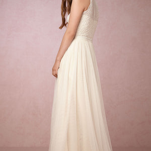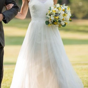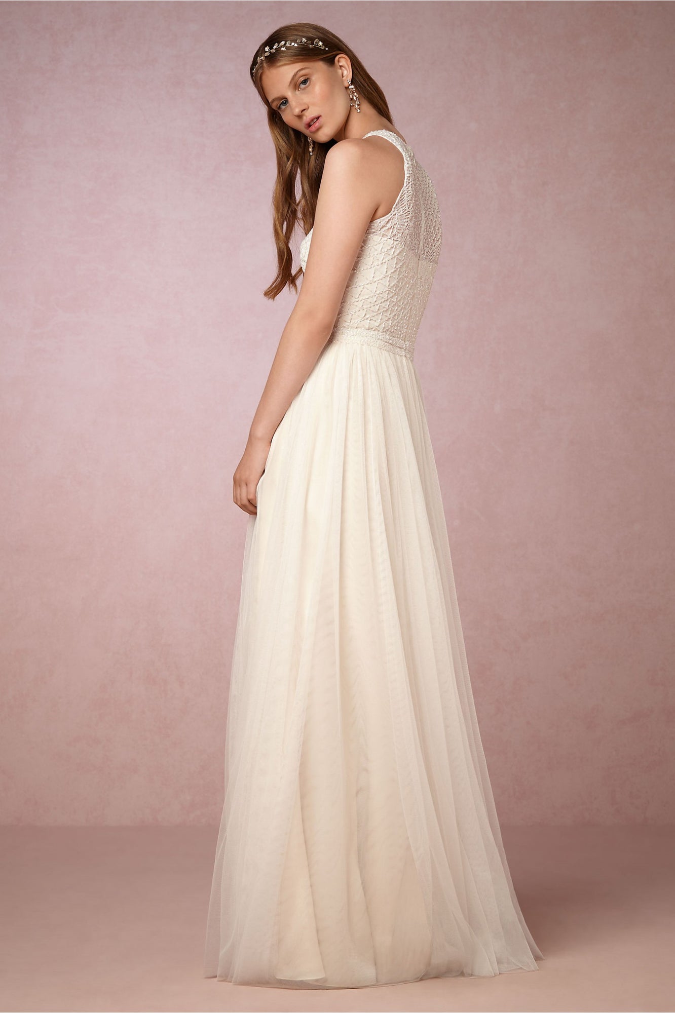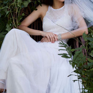 Geometric beading on the bodice (front and back!) brings a modern luxe feel to this halter neck style. Finished with a super-soft tulle skirt, this gown is a beautiful option for a contemporary bride. By Etoile.