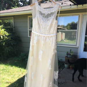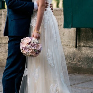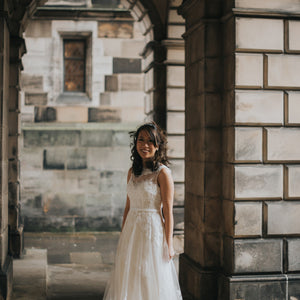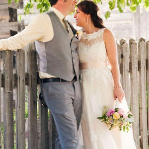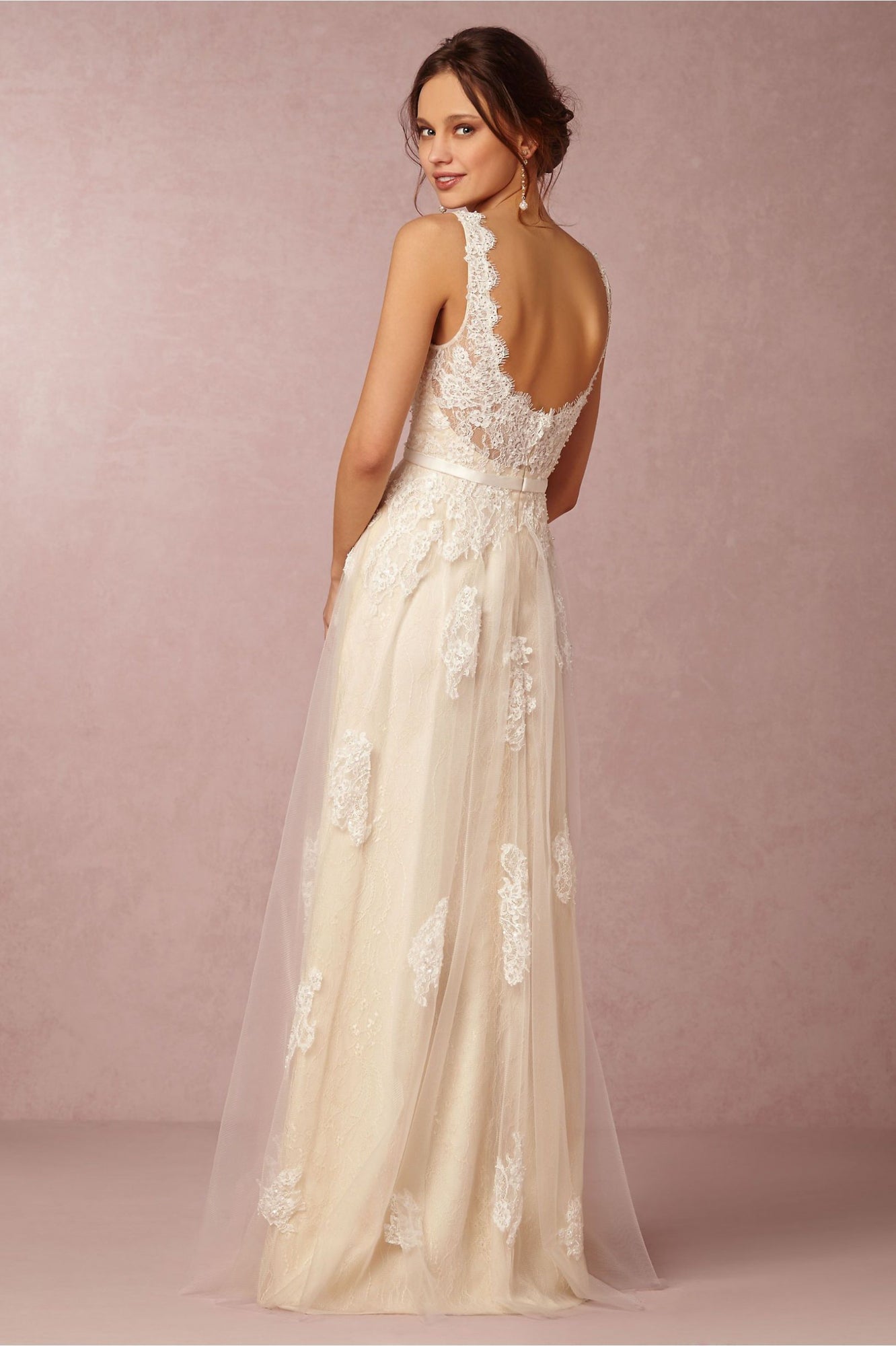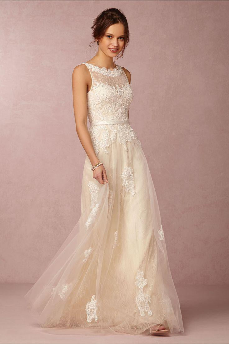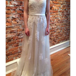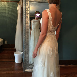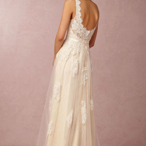 Inspired by literature, love, and European design, Etoile's designs effortlessly marry vintage and contemporary. With a touch of Old World romance, this stunning ivory gown features an illusion neckline, lace applique, a tulle overlay, and, for a modern twist, a delicate scattering of sequins. Its soft silhouette, scooped back and eyelash lace lend a feminine air that is, quite possibly, unparalleled.