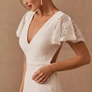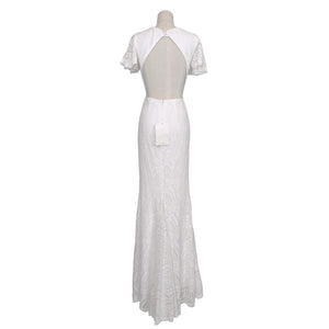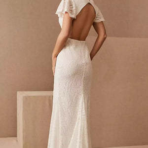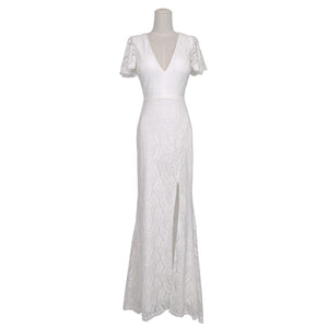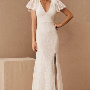 Draped with intricate allover lace, this bridal maxi dress has a sophisticated silhouette and sultry high slit. This elegant white lace wedding gown features a v-neckline, fluttery lace sleeves, an open back, sewn-in bra cups, 2 fabric covered buttons at the back of neck, daring high slit, and is fully lined (sleeves are unlined).